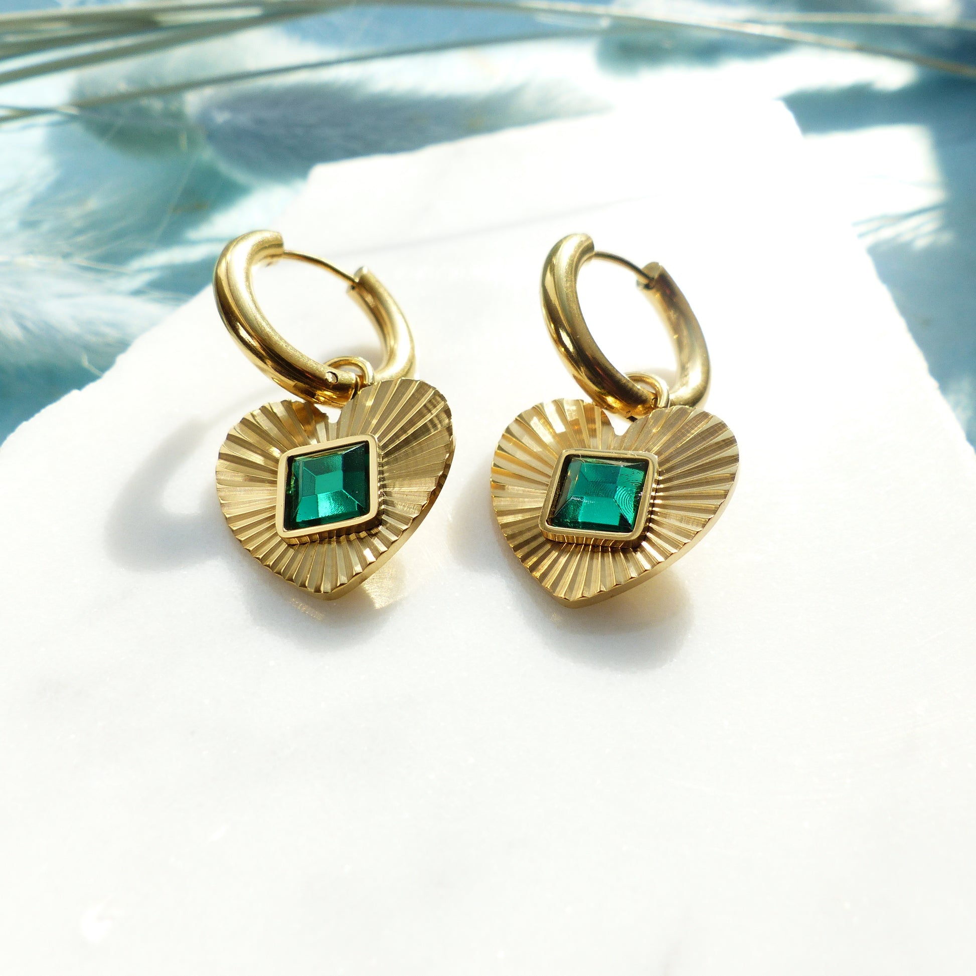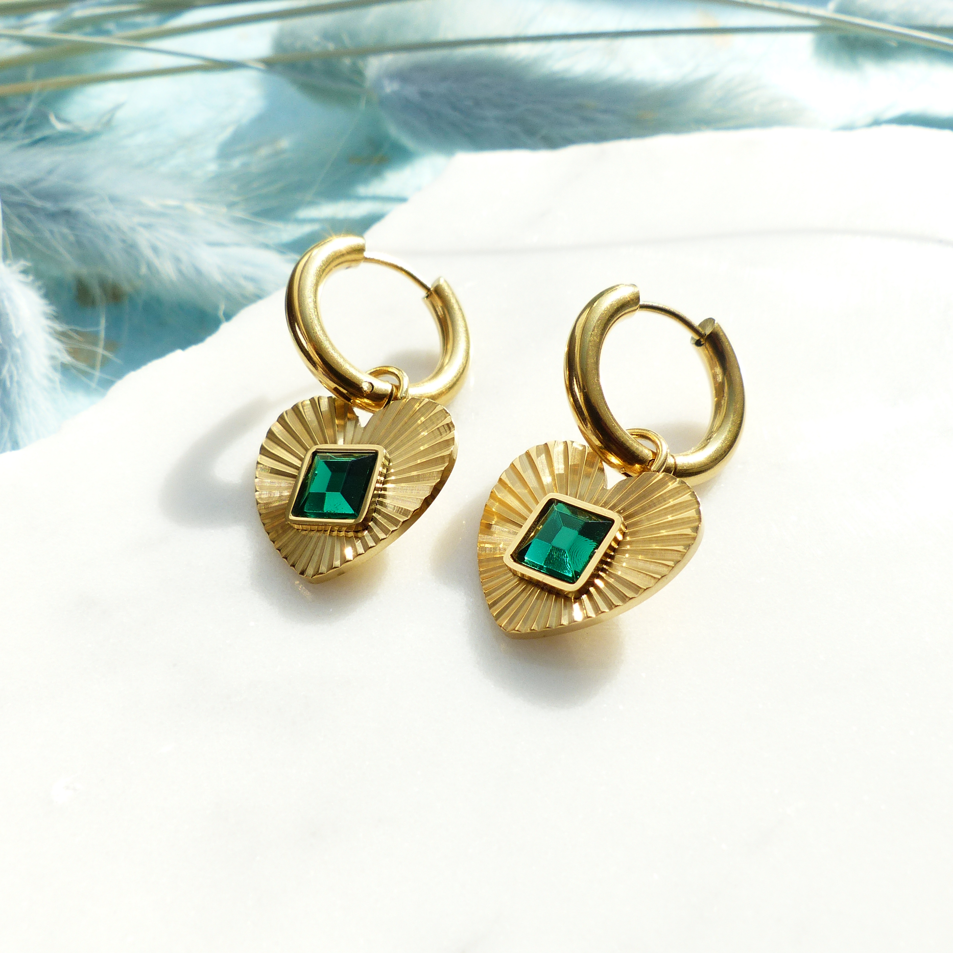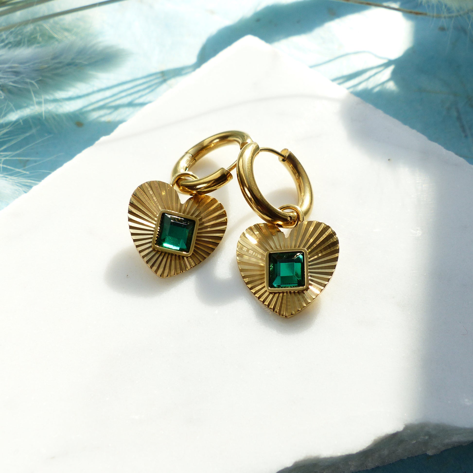 Diese Ohrringe aus vergoldetem Edelstahl haben einen herzförmigen Anhänger mit strahlenförmigen Details und einem grünfunkelnden Stein in der Mitte. Das Zusammenspiel der warmen Goldtöne und des intensiven Grüns verleiht den Ohrringen eine ausdrucksstarke Wirkung, während das Design klassische Romantik mit modernen Akzenten vereint. Perfekt für einen selbstbewussten Look, der Wert auf besondere Details legt.