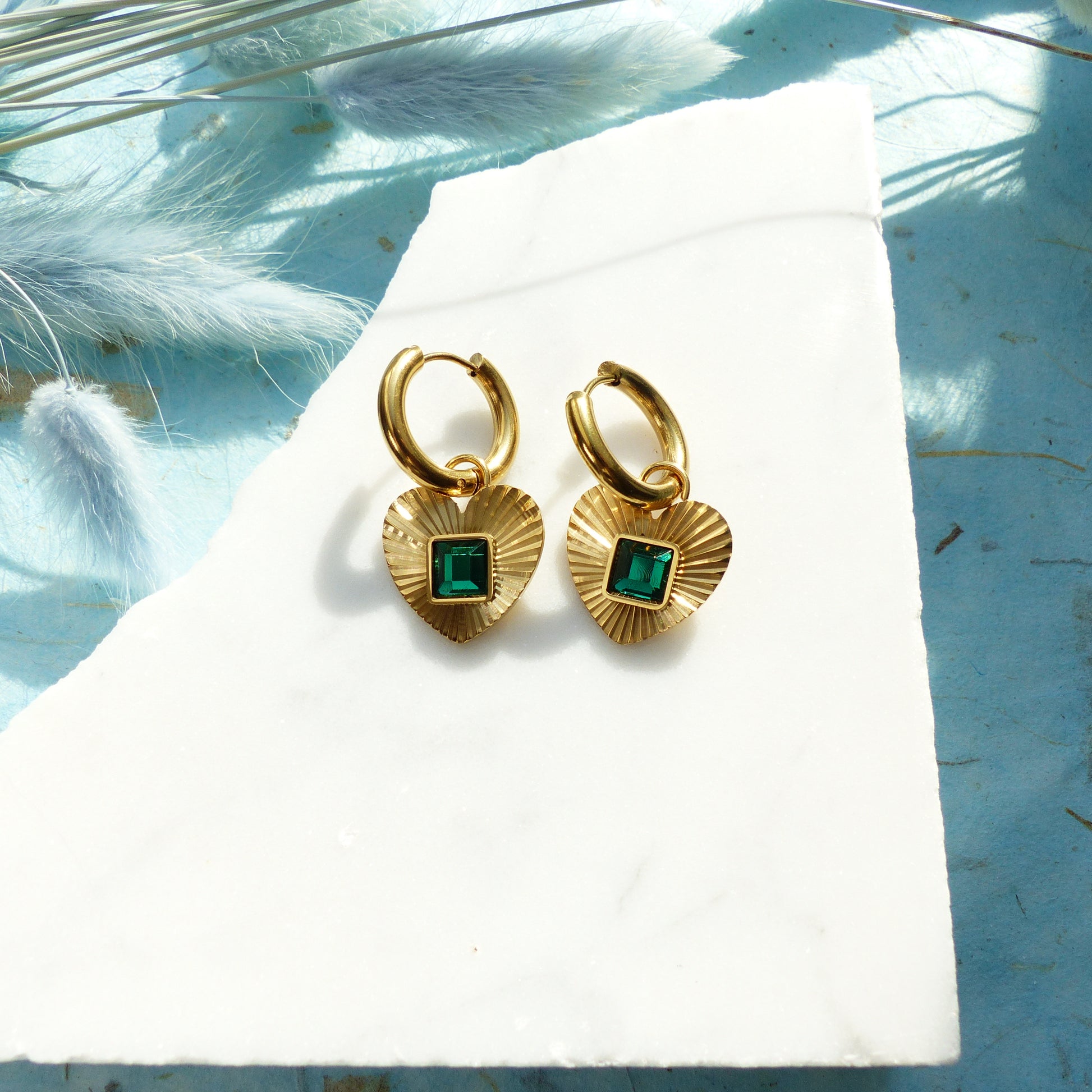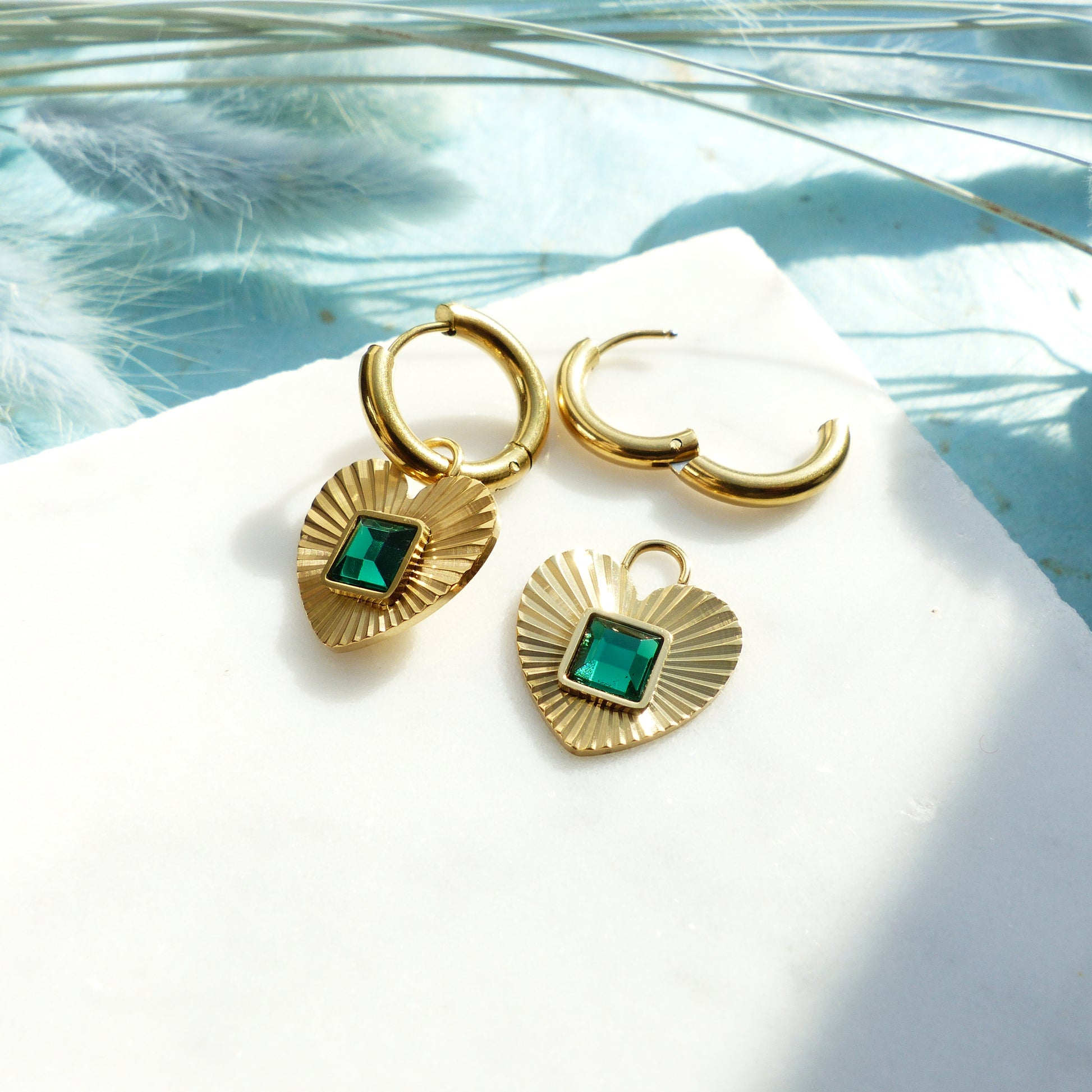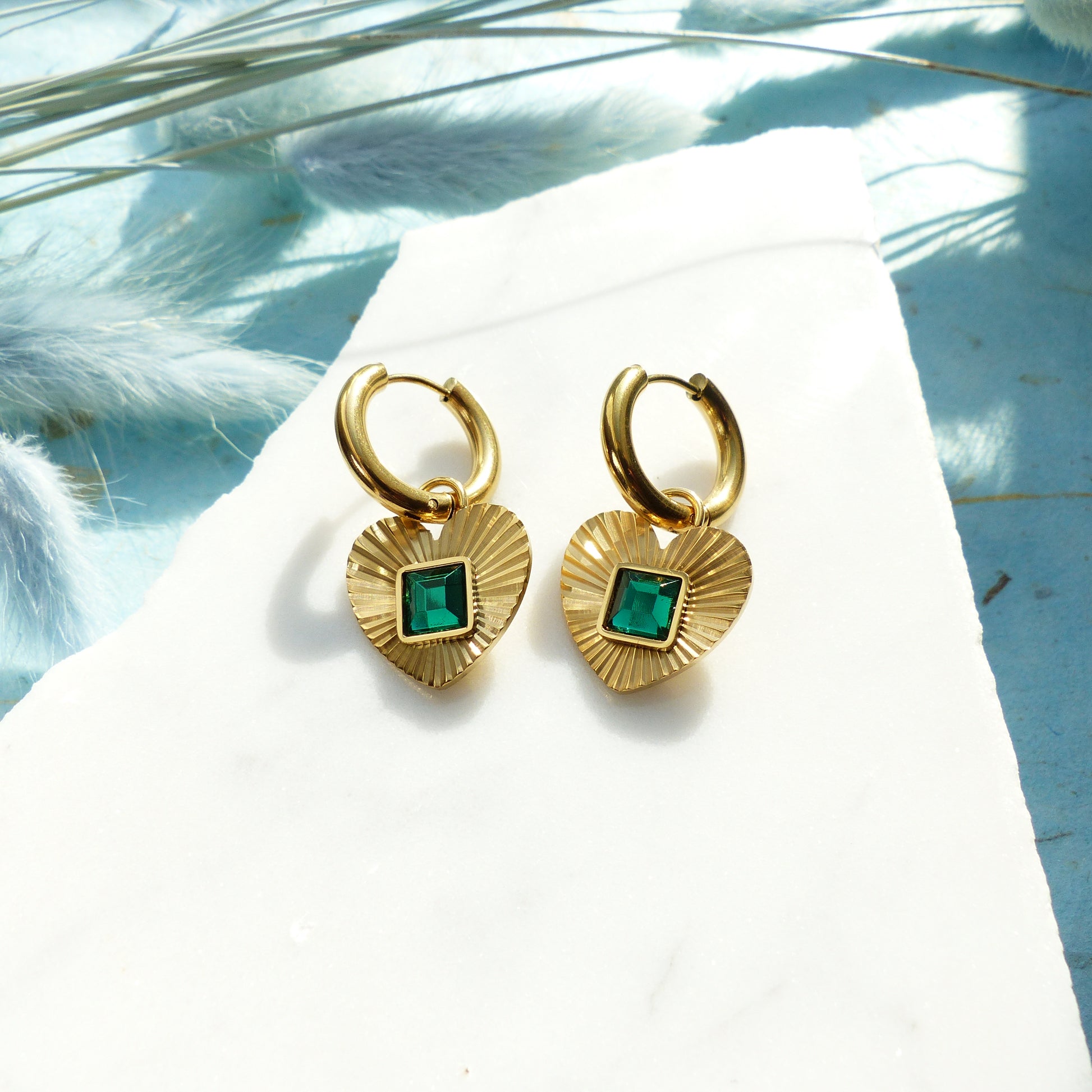 Diese Ohrringe aus vergoldetem Edelstahl haben einen herzförmigen Anhänger mit strahlenförmigen Details und einem grünfunkelnden Stein in der Mitte. Das Zusammenspiel der warmen Goldtöne und des intensiven Grüns verleiht den Ohrringen eine ausdrucksstarke Wirkung, während das Design klassische Romantik mit modernen Akzenten vereint. Perfekt für einen selbstbewussten Look, der Wert auf besondere Details legt.