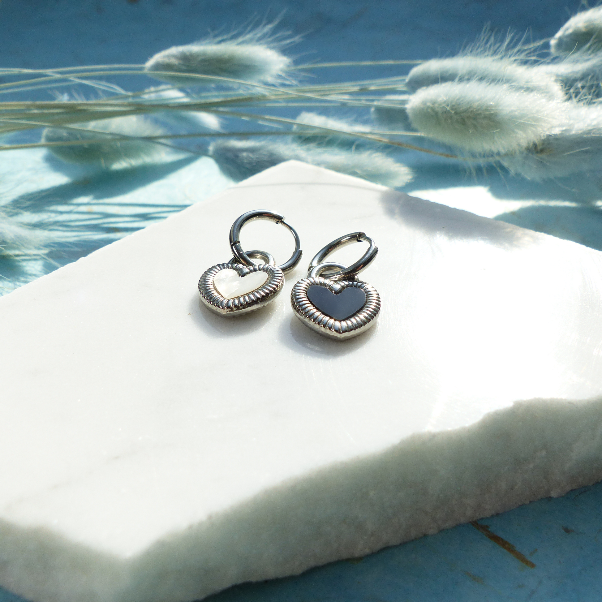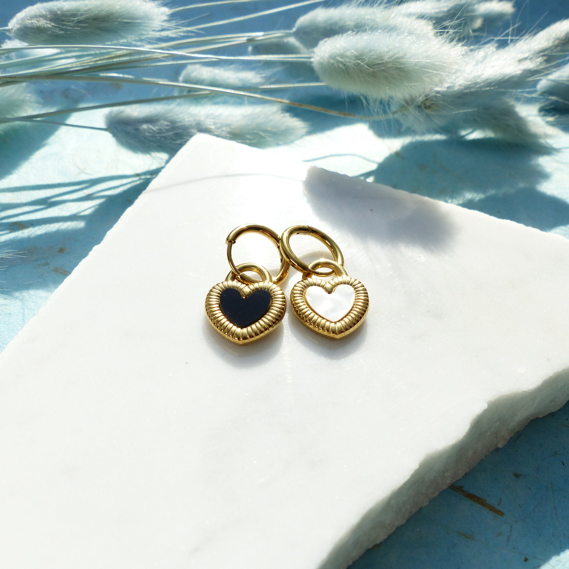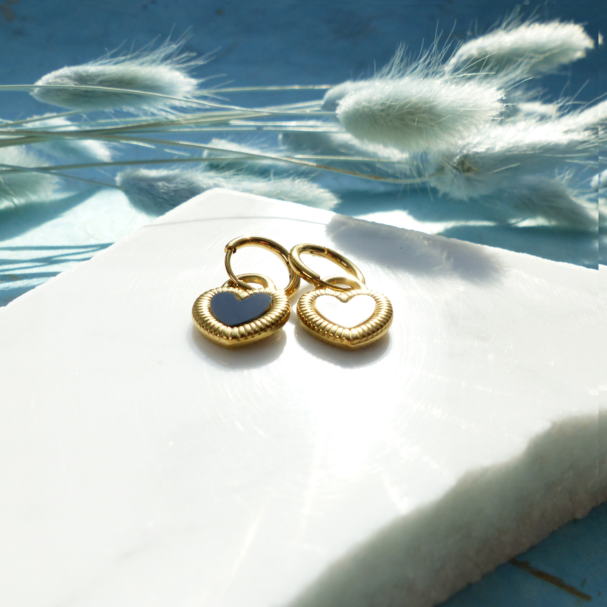 Diese schlichten aber sehr süßen Ohrringe mit Herzanhängern bieten flexible Styling-Möglichkeiten. Sie bestehen aus Edelstahl, die goldene Variante ist vergoldet. Die Herzen mit feiner Rillenstruktur haben eine schwarze Vorderseite und eine weiße Rückseite – einfach wenden, um zwischen Schwarz und Weiß zu wechseln. Ideal für jeden Anlass, von casual bis besonders.
