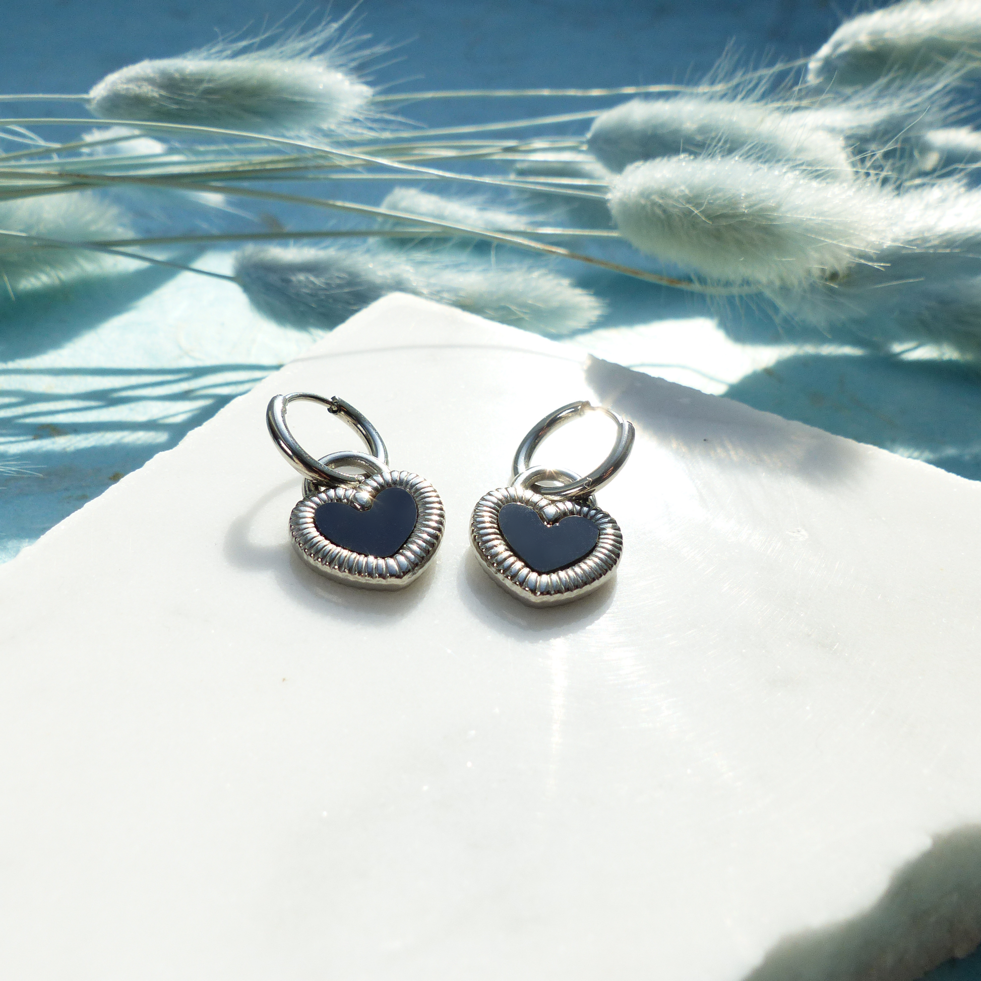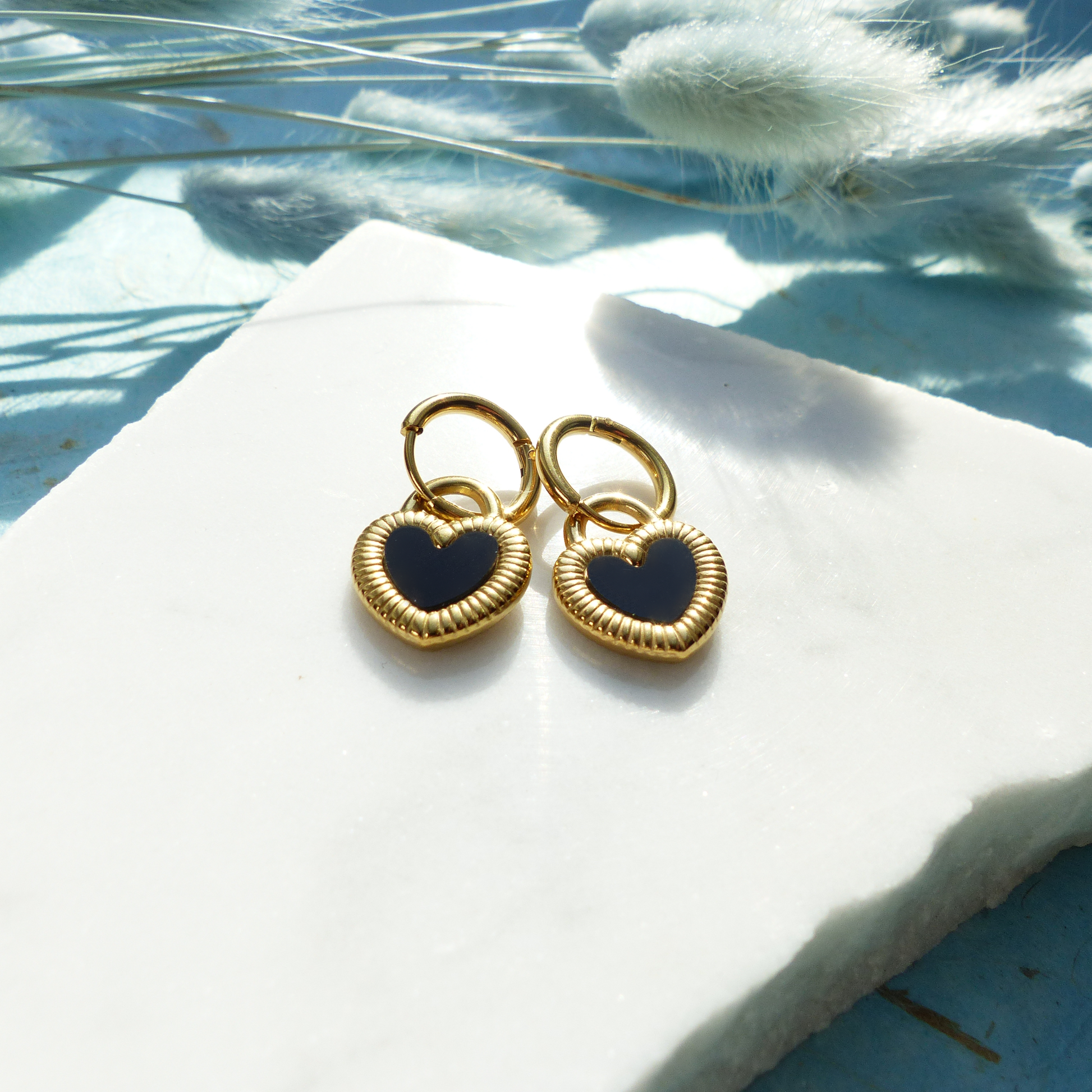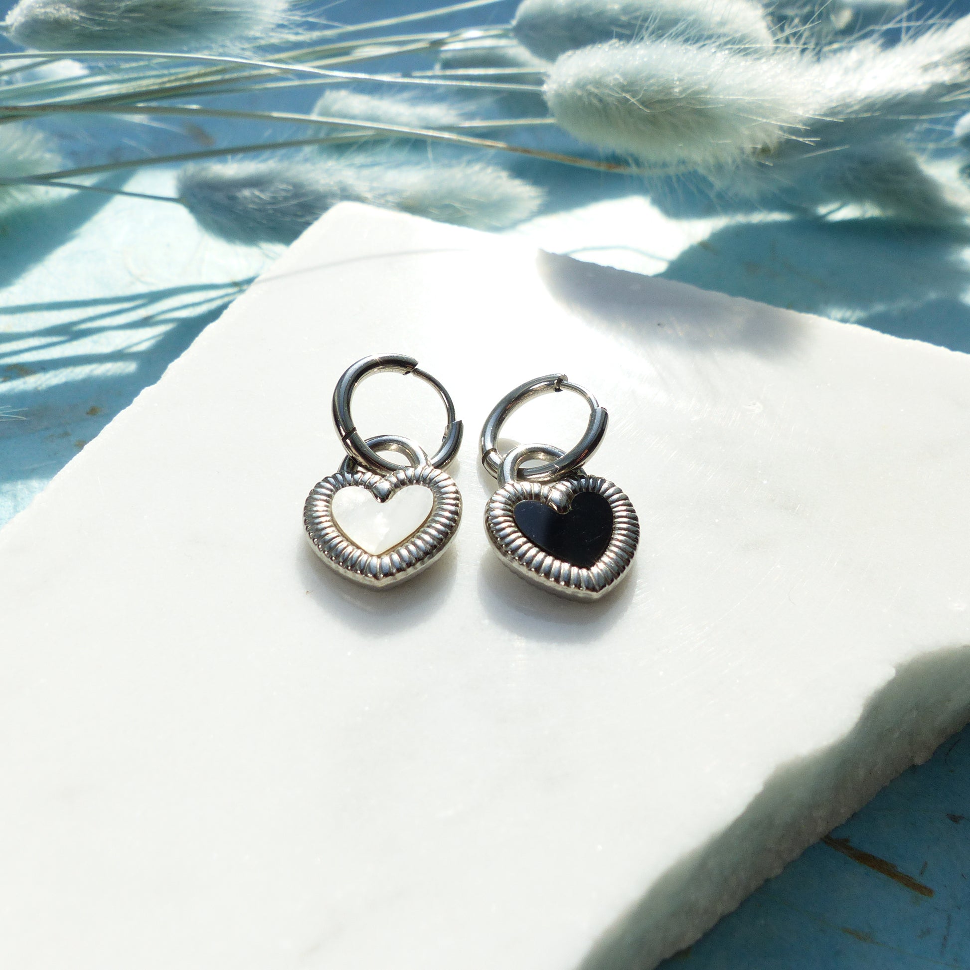Diese schlichten aber sehr süßen Ohrringe mit Herzanhängern bieten flexible Styling-Möglichkeiten. Sie bestehen aus Edelstahl, die goldene Variante ist vergoldet. Die Herzen mit feiner Rillenstruktur haben eine schwarze Vorderseite und eine weiße Rückseite – einfach wenden, um zwischen Schwarz und Weiß zu wechseln. Ideal für jeden Anlass, von casual bis besonders.
