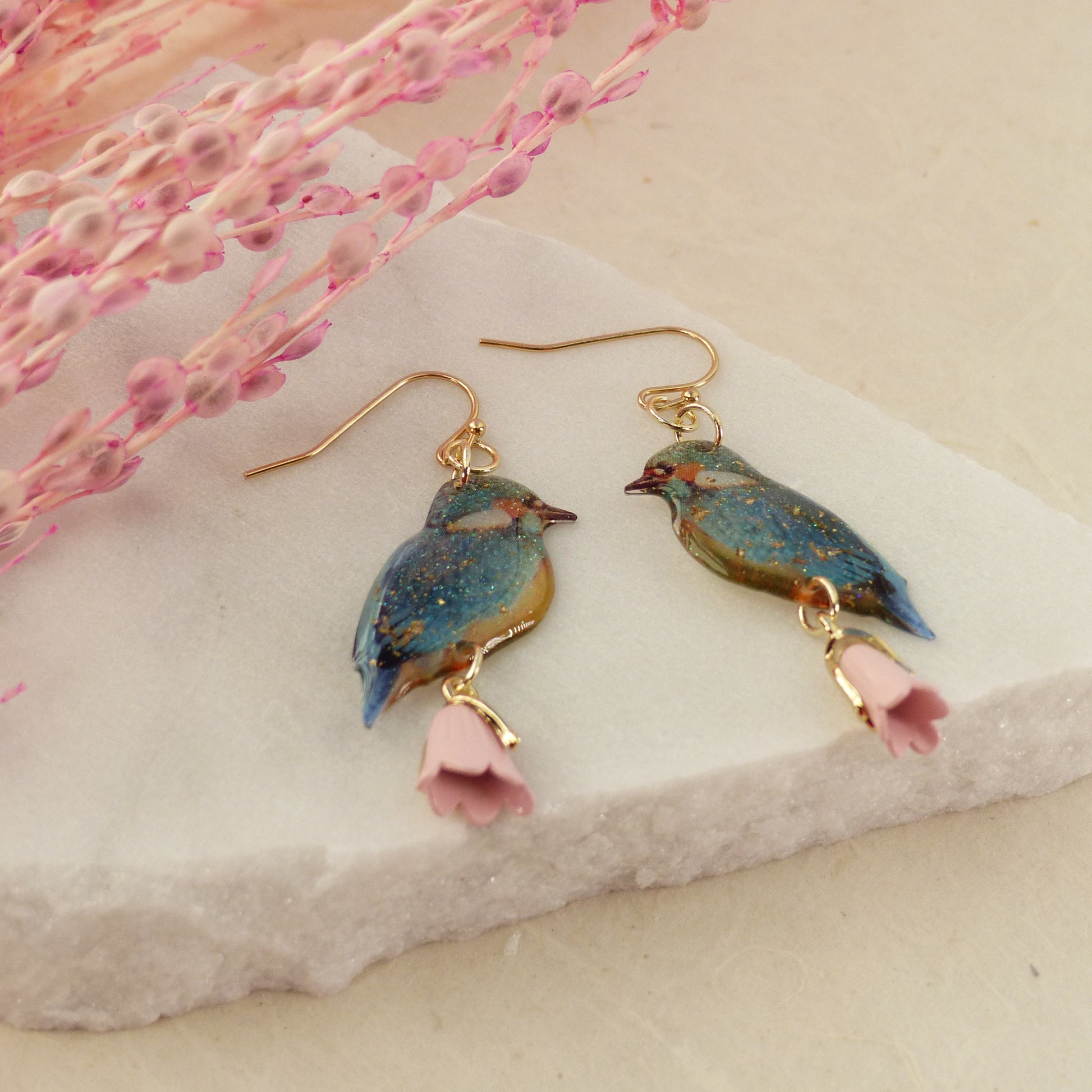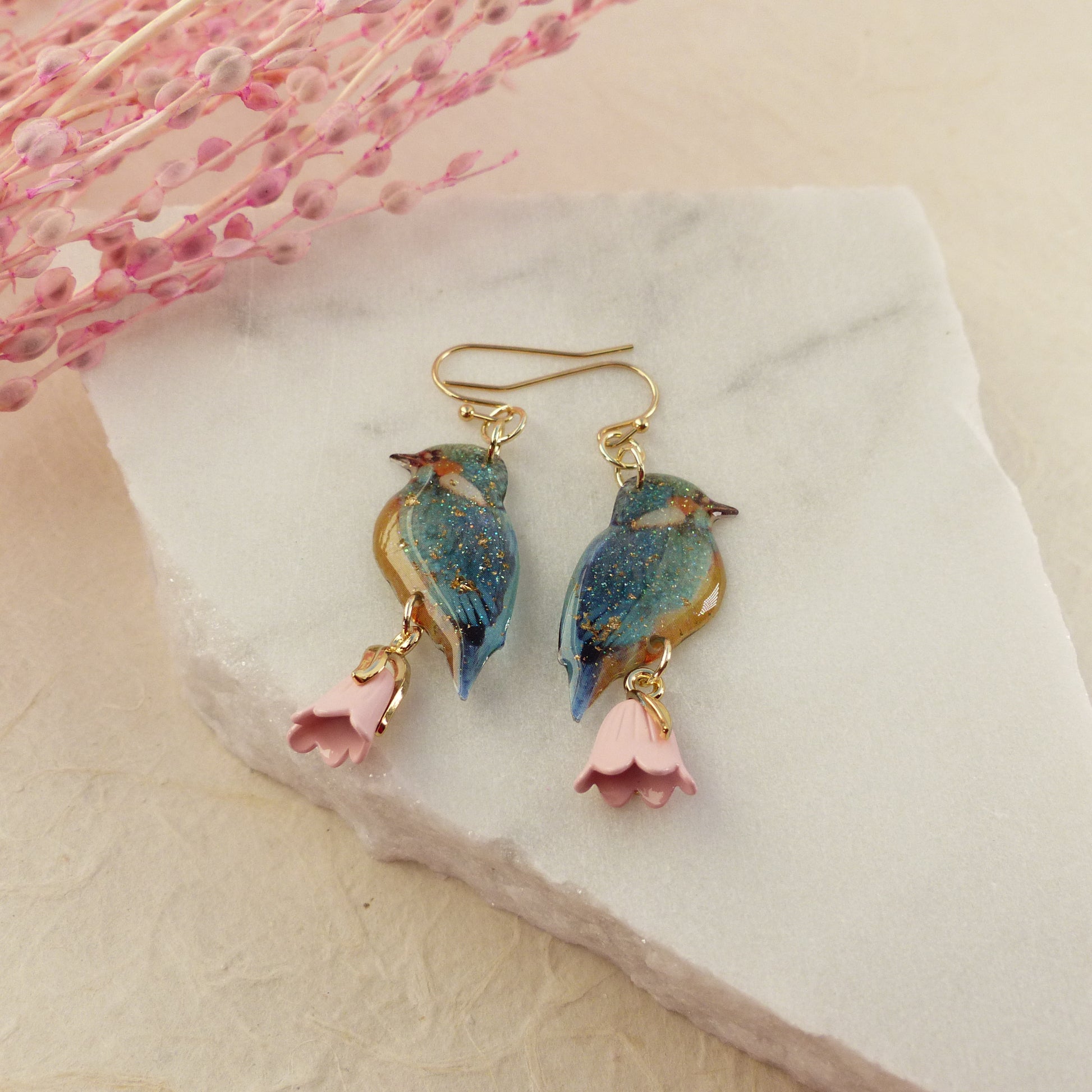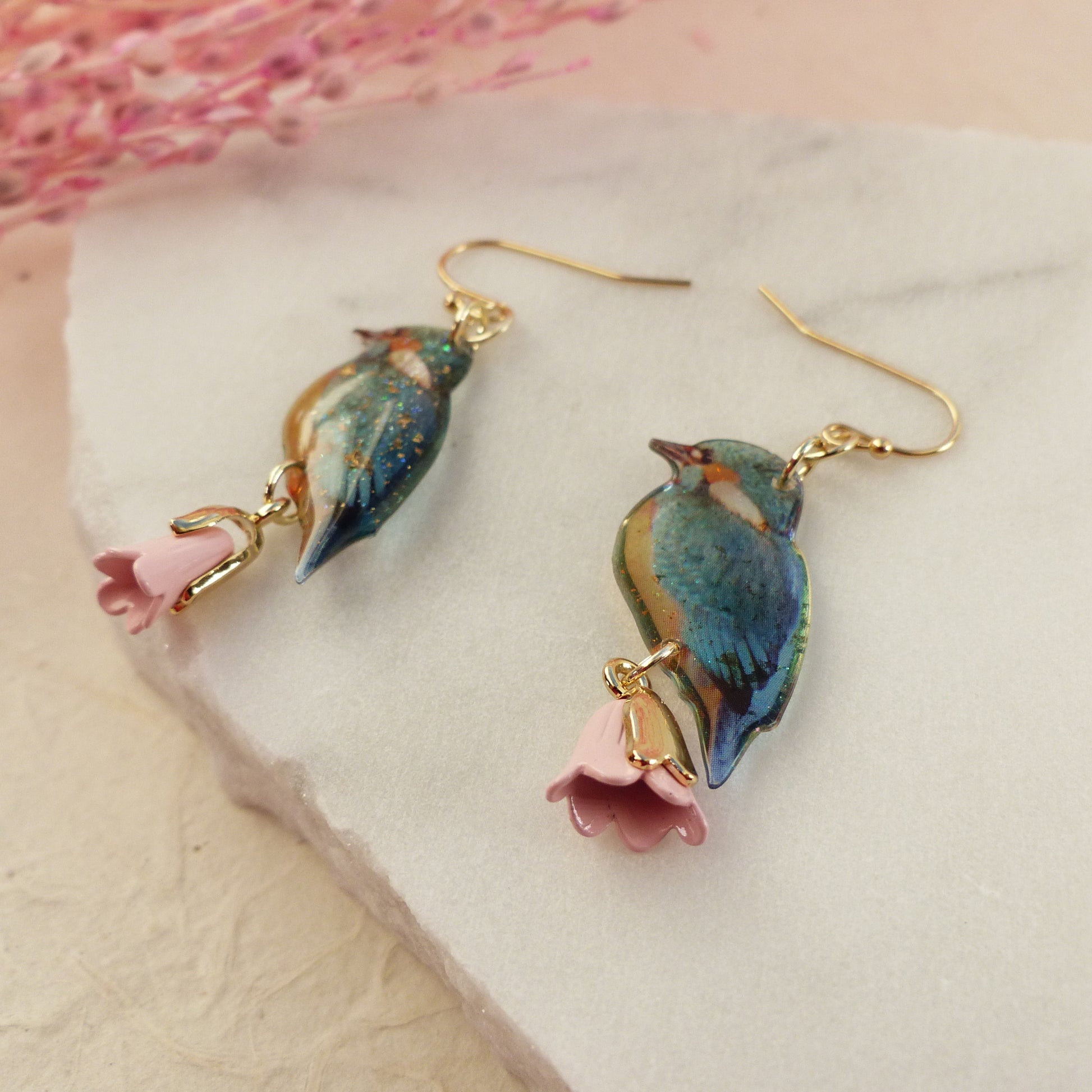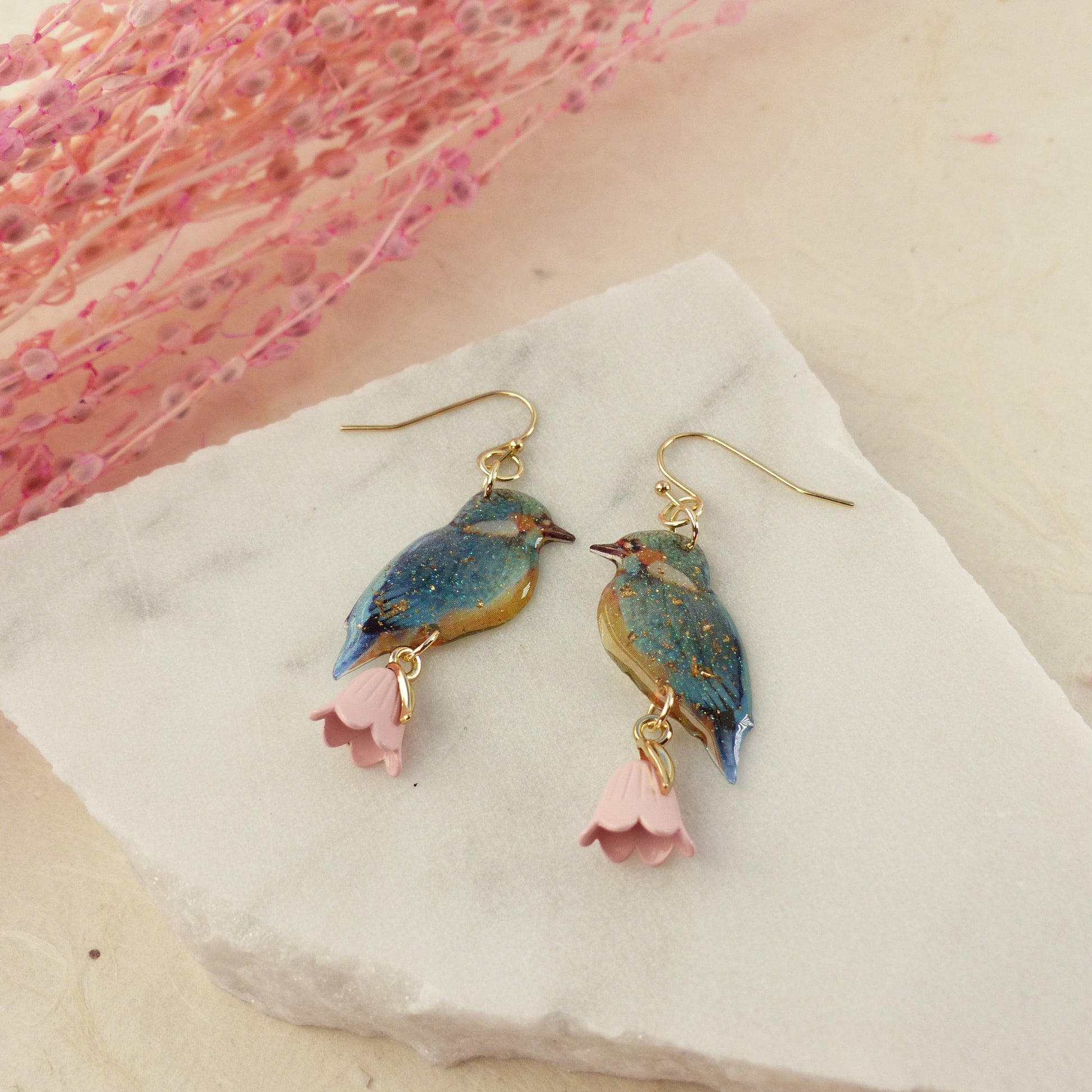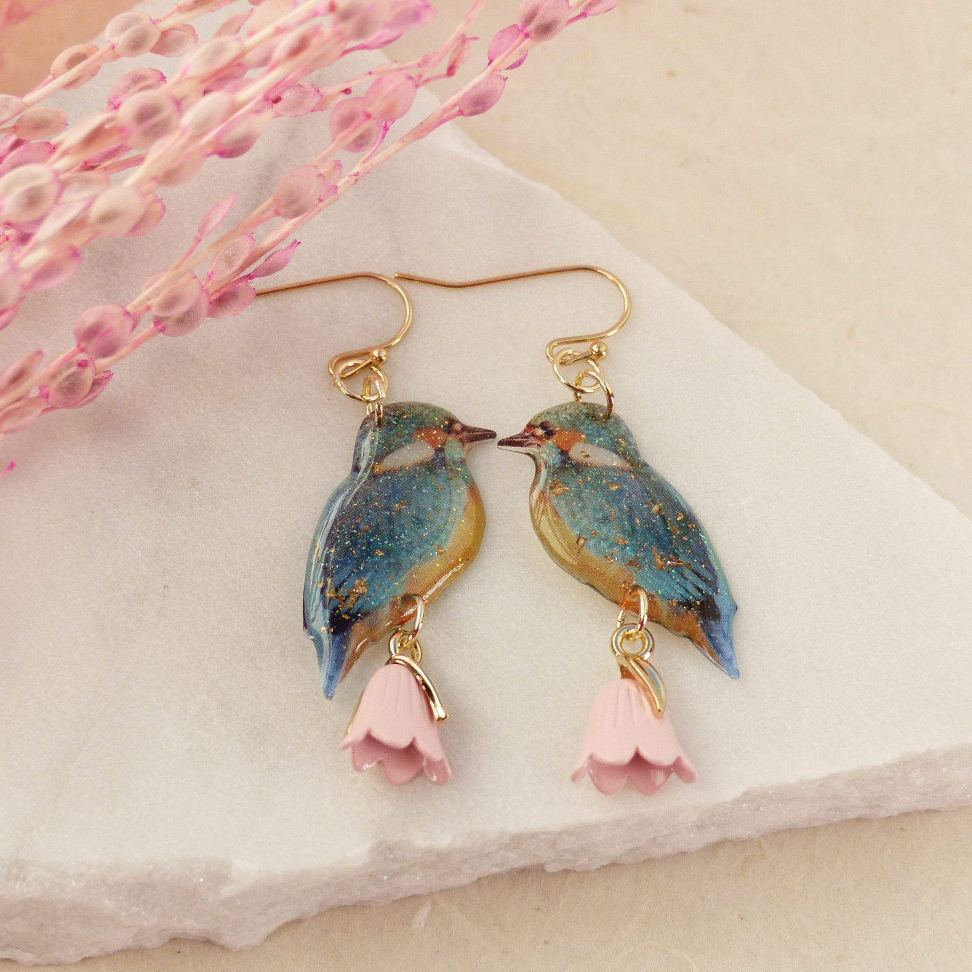 Diese verträumten Ohrringe zeigen filigrane Eisvögel, verziert mit feinen Details wie schimmerndem Goldstaub im Kunstharz und einer zarten rosa Blume. Ihr romantisches Design erinnert an nostalgische Illustrationen aus alten Büchern – kleine Schmuckstücke mit besonderem Charme, die deinen Look liebevoll unterstreichen.