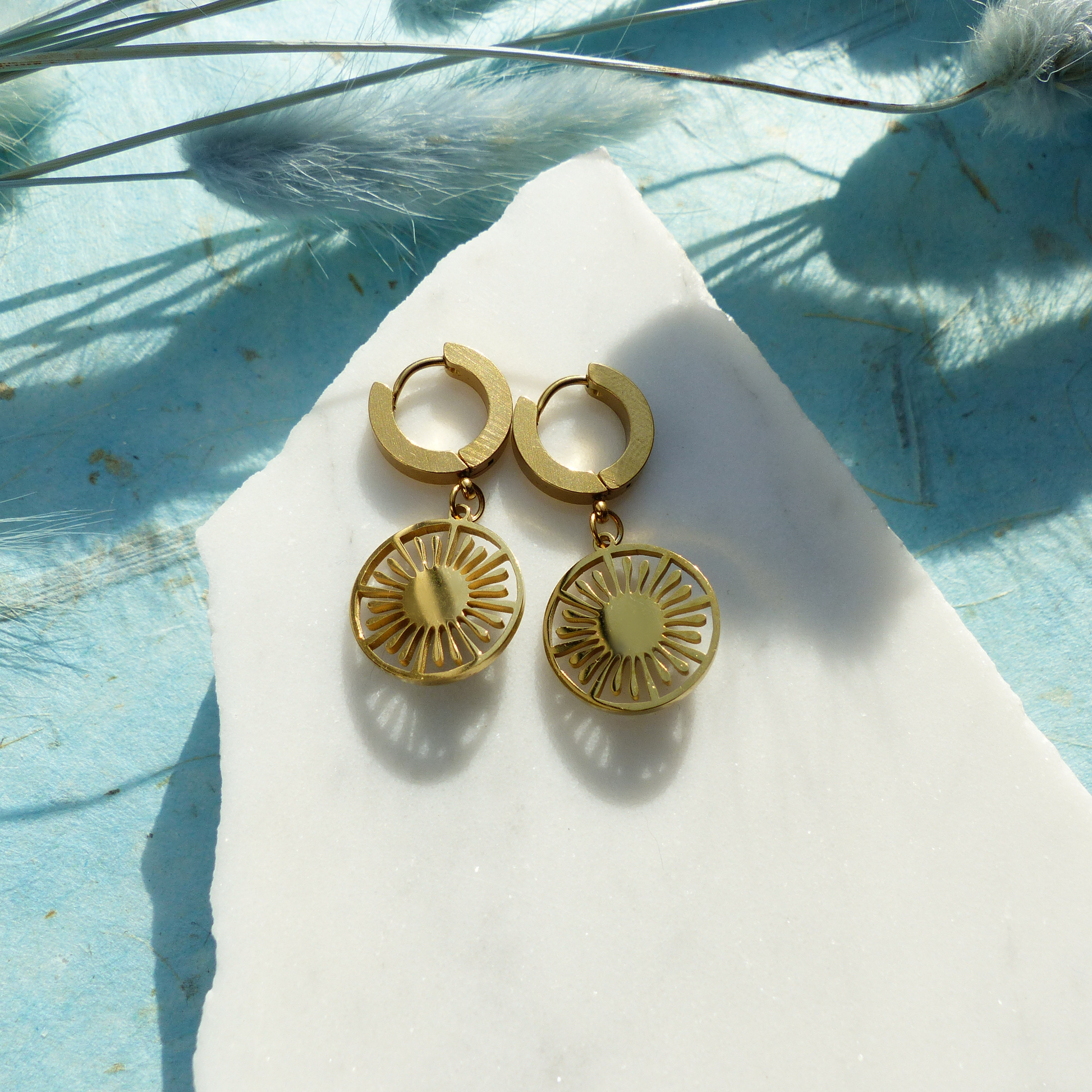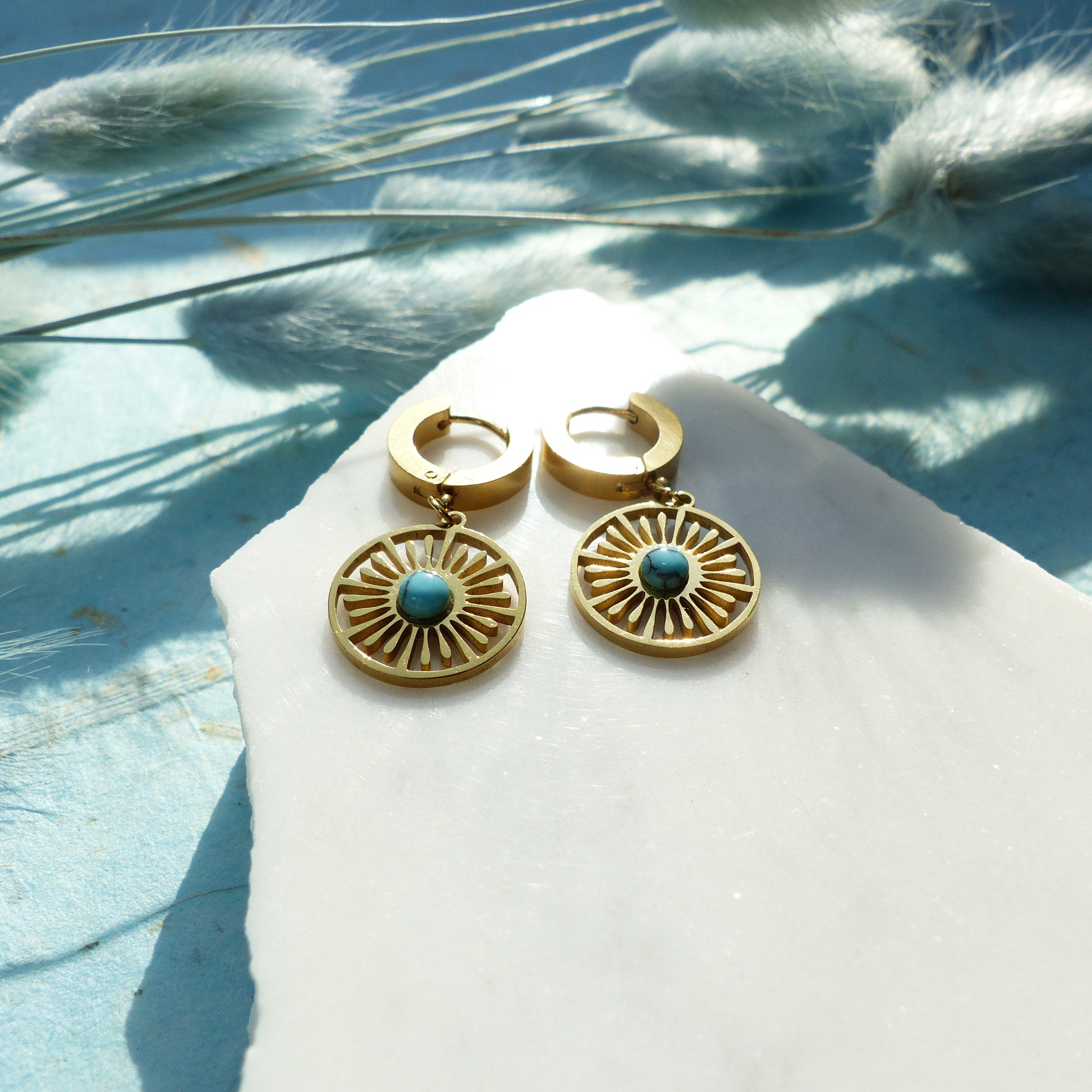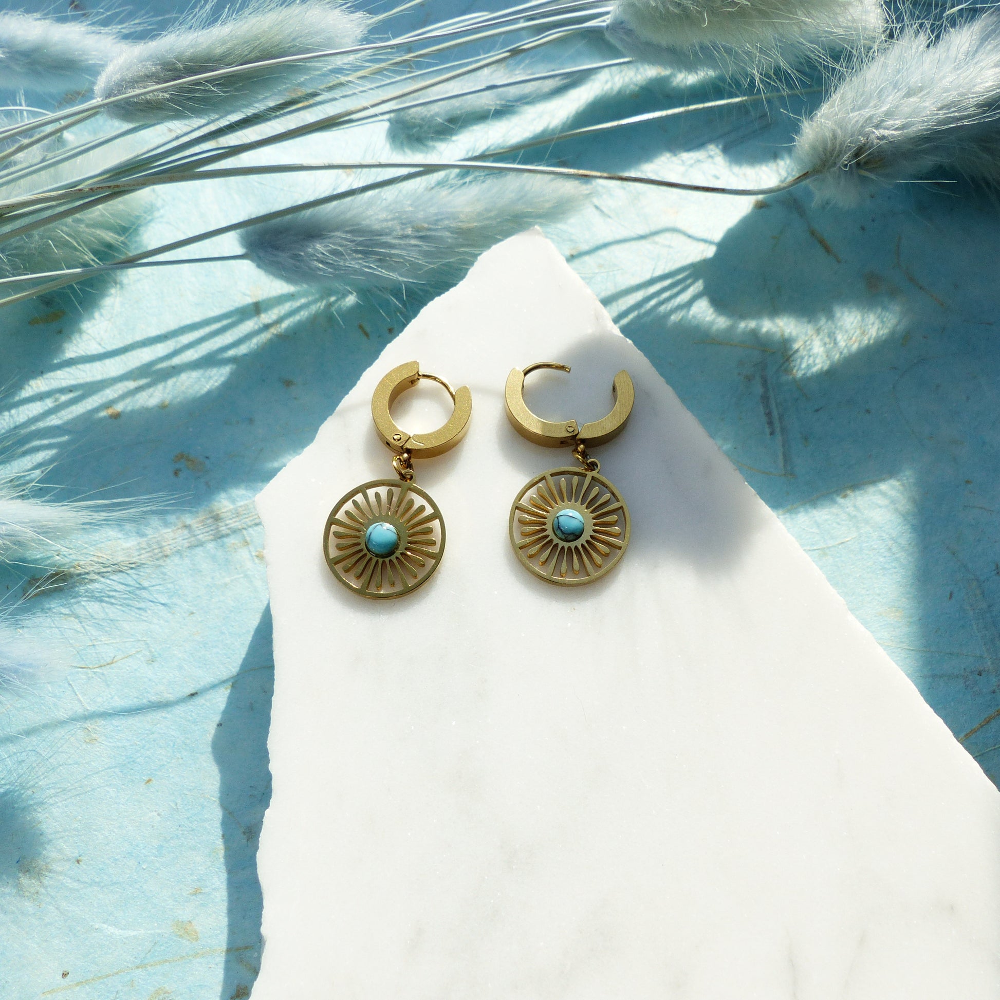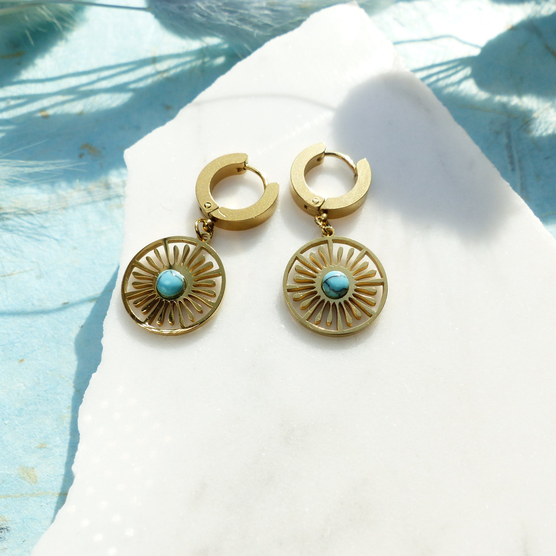 Diese vergoldeten Edelstahl-Ringe sind mit einem runden Anhänger versehen, der einen türkisfarbenen Stein in der Mitte trägt, umgeben von einem filigranen Sonnenmotiv. Das Zusammenspiel von warmem Gold und kühlem Türkis verleiht den Ohrringen eine ausdrucksstarke Wirkung – perfekt für alle, die einzigartige Akzente setzen möchten.