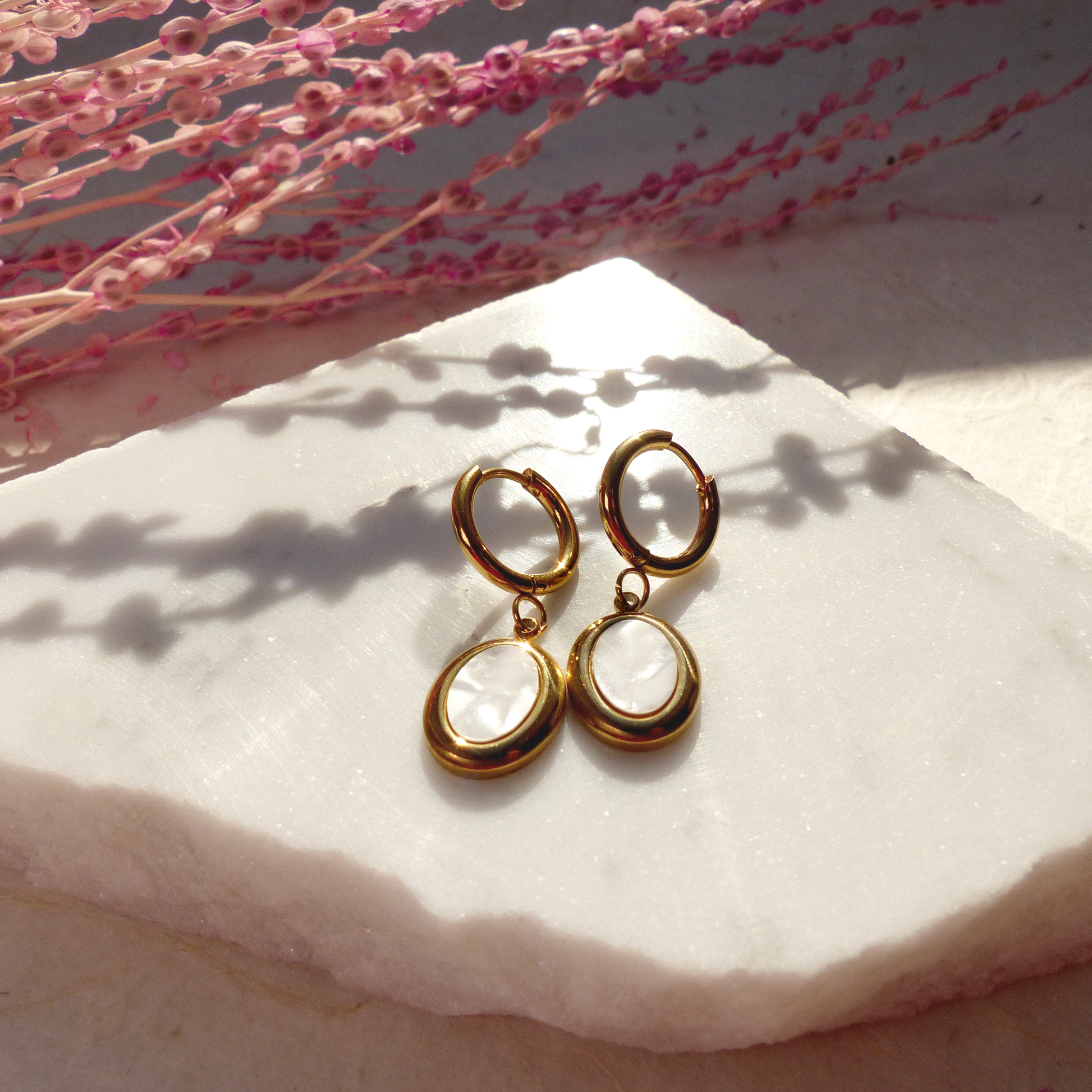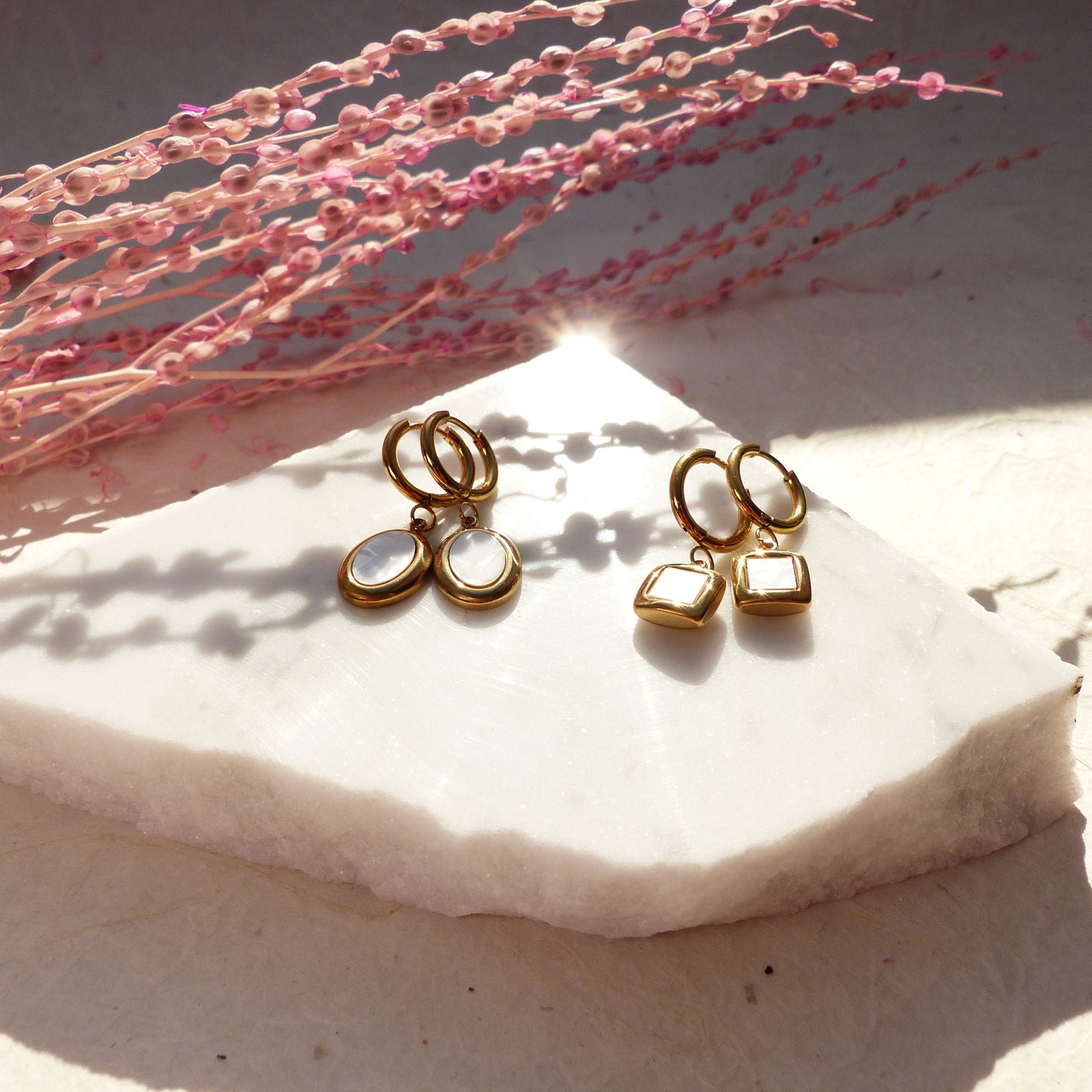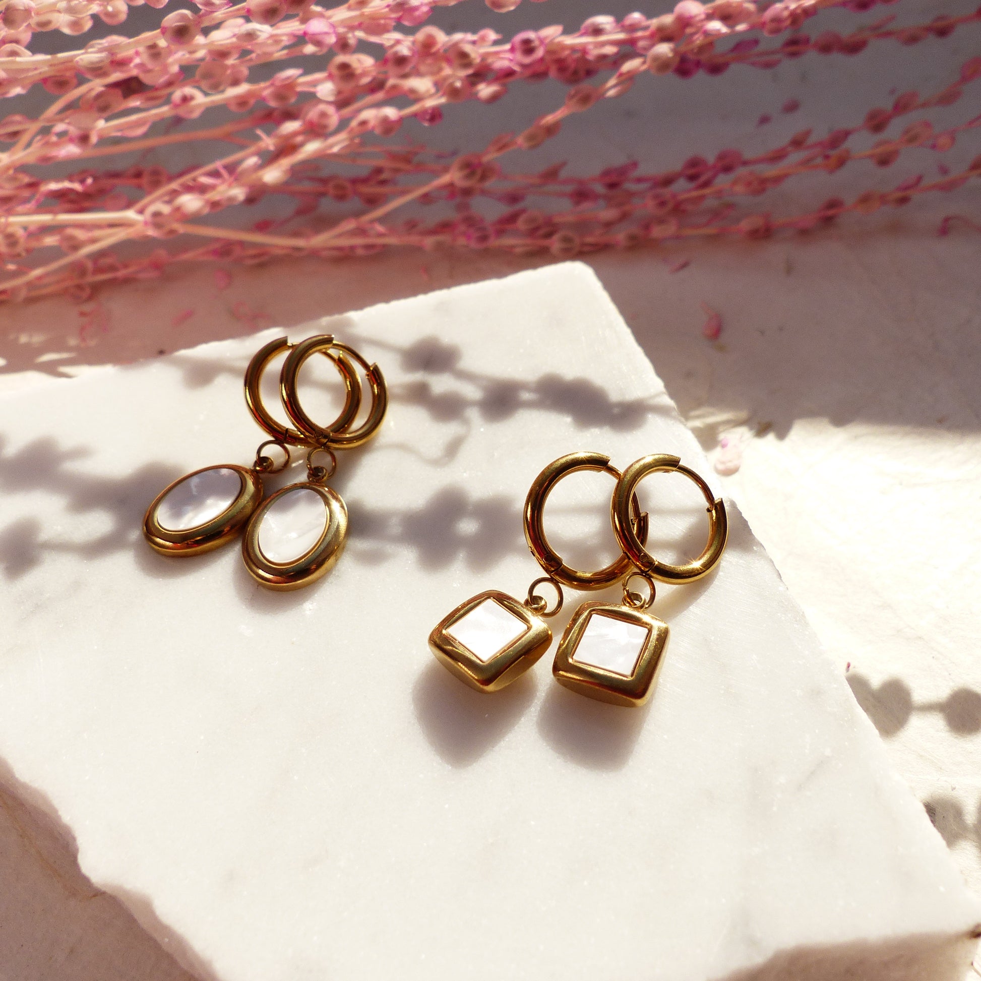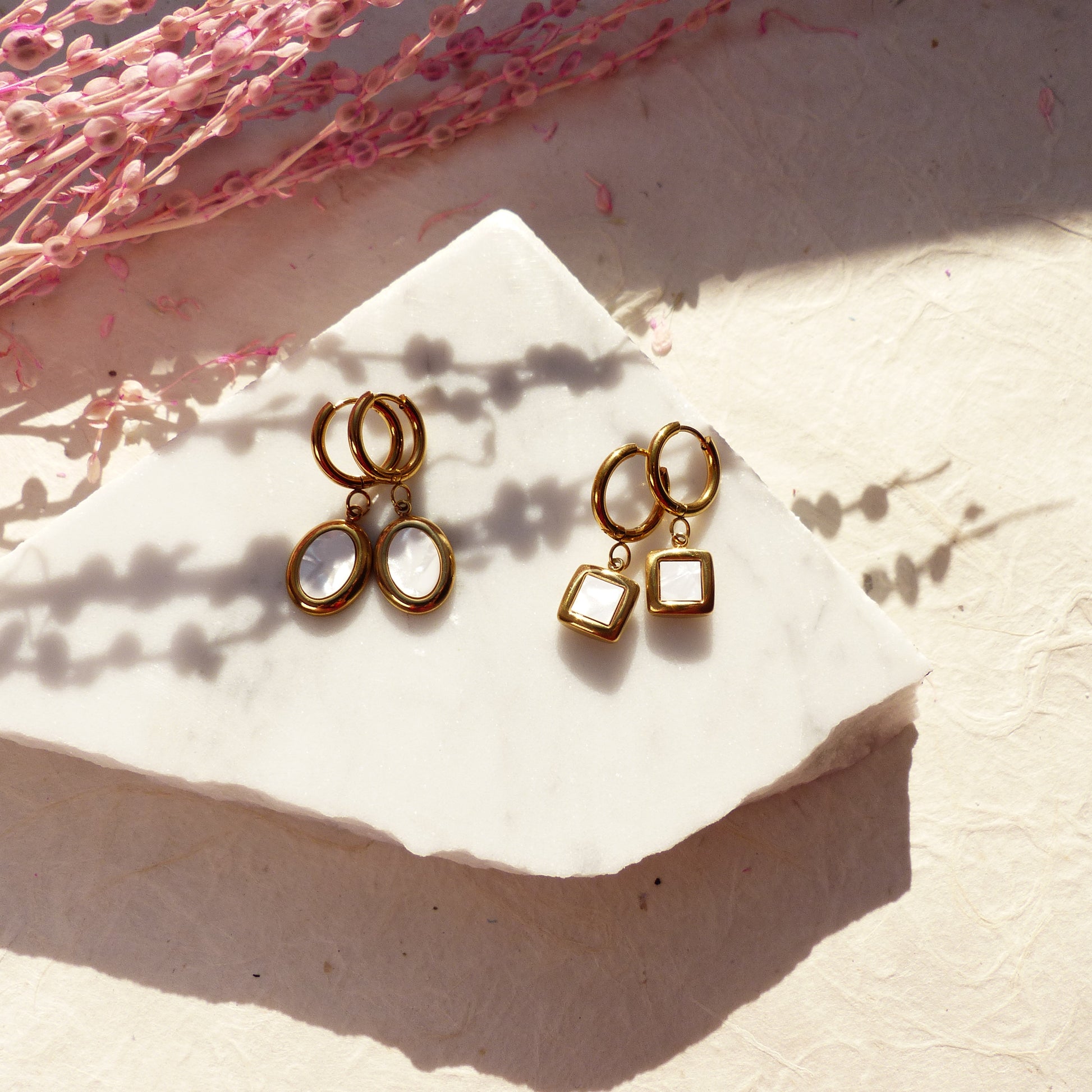 Die kleinen goldenen Ringe aus vergoldetem Edelstahl tragen zarte Anhänger – einer oval, der andere eckig, beide haben schimmerndem Perlmutt eingefasst. Fein und elegant umrahmen sie das Gesicht - perfekt für Tage, an denen du mit sanften Akzenten glänzen möchtest, sei es bei einem ruhigen Treffen oder einem stilvollen Abend.