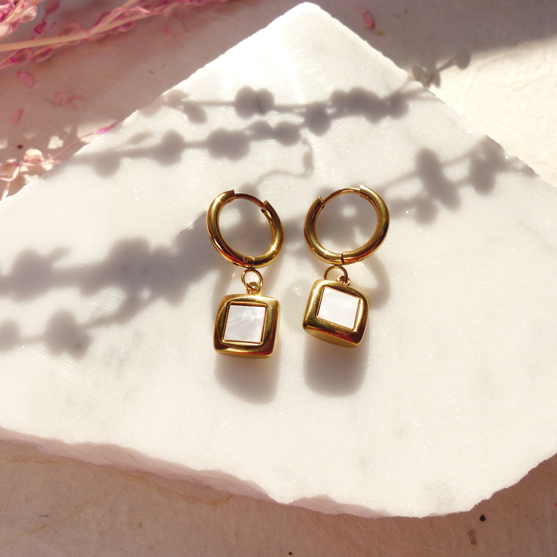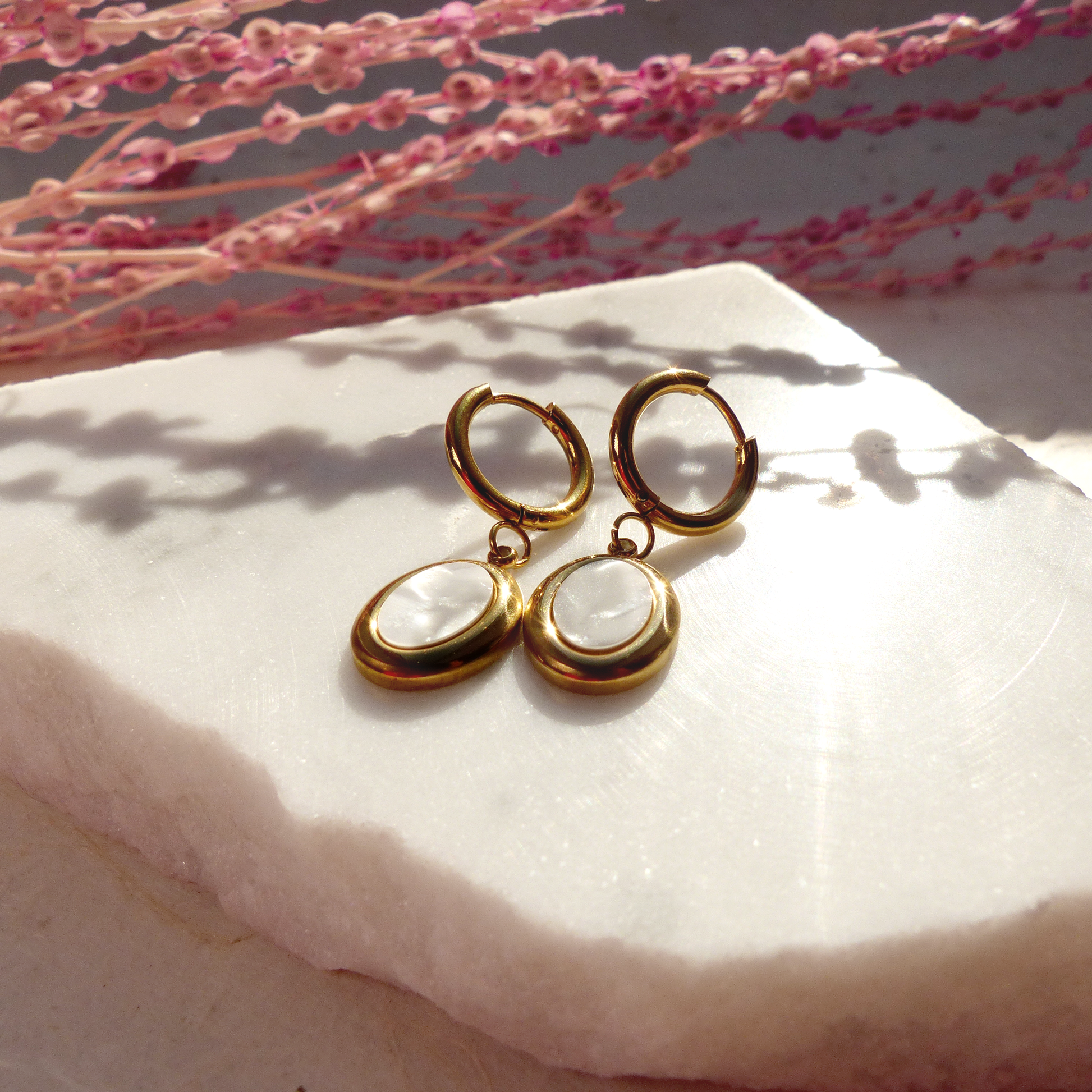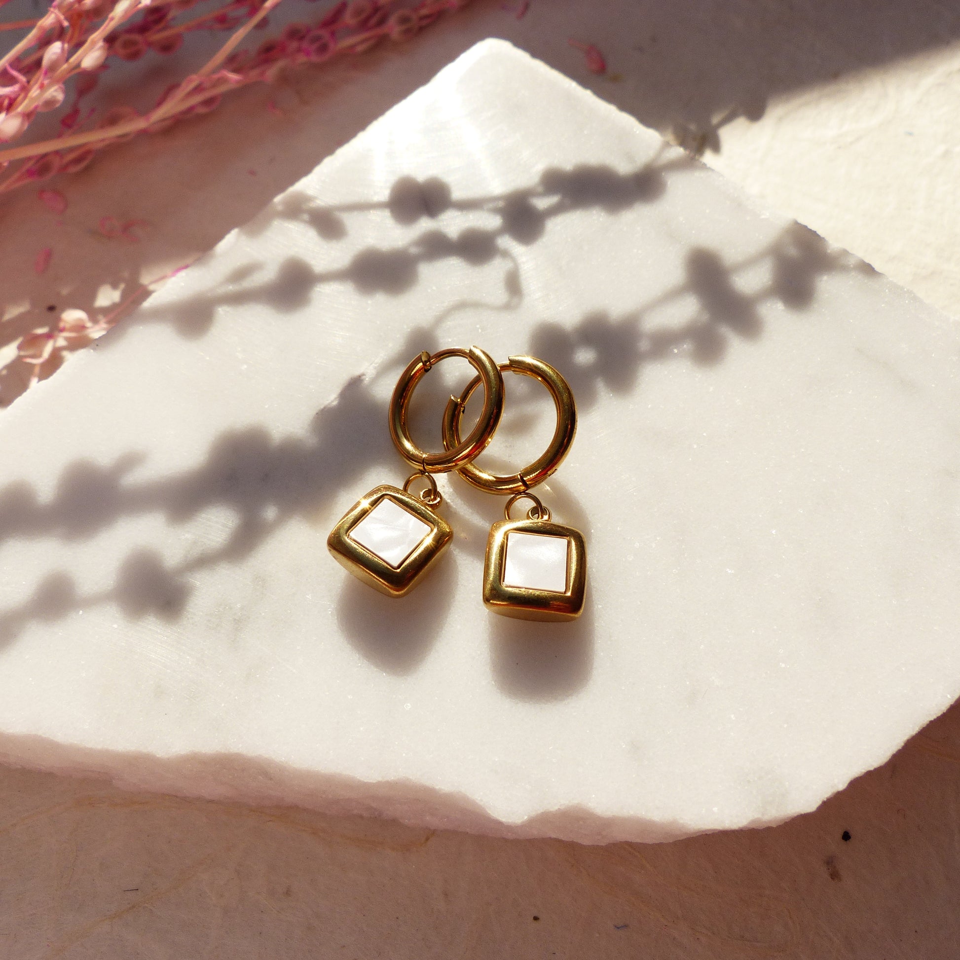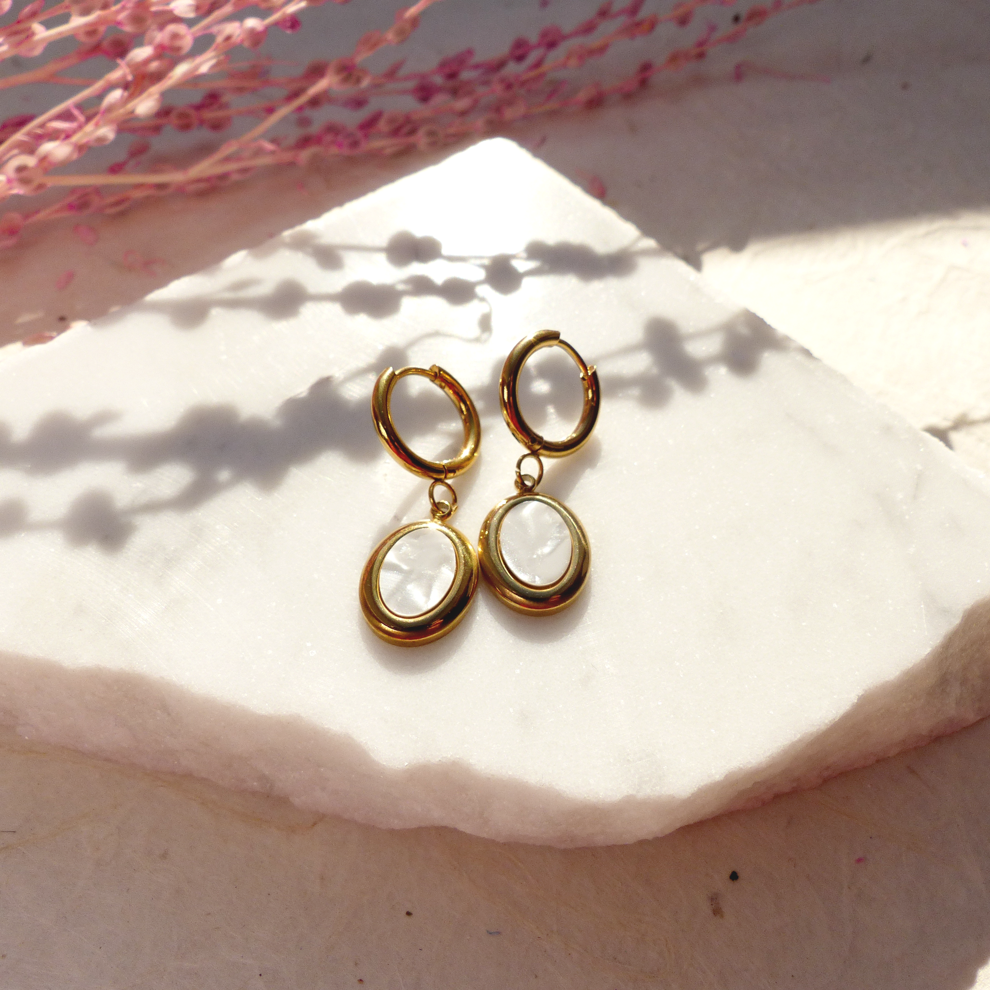 Die kleinen goldenen Ringe aus vergoldetem Edelstahl tragen zarte Anhänger – einer oval, der andere eckig, beide haben schimmerndem Perlmutt eingefasst. Fein und elegant umrahmen sie das Gesicht - perfekt für Tage, an denen du mit sanften Akzenten glänzen möchtest, sei es bei einem ruhigen Treffen oder einem stilvollen Abend.
