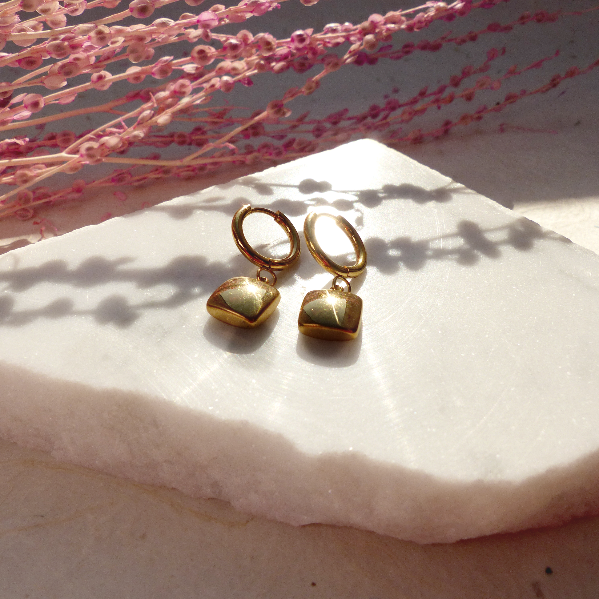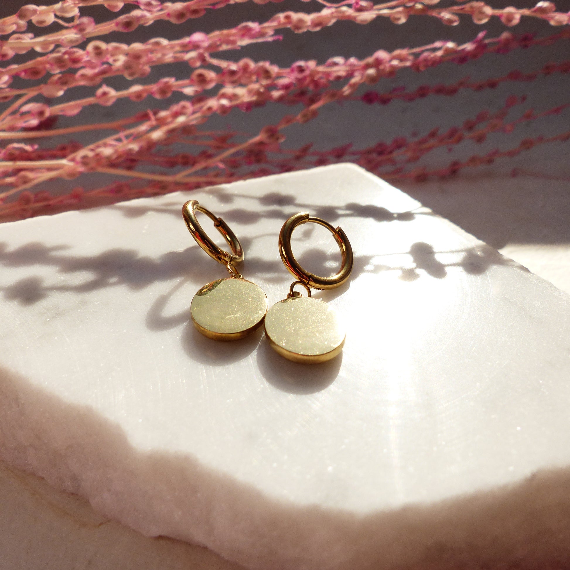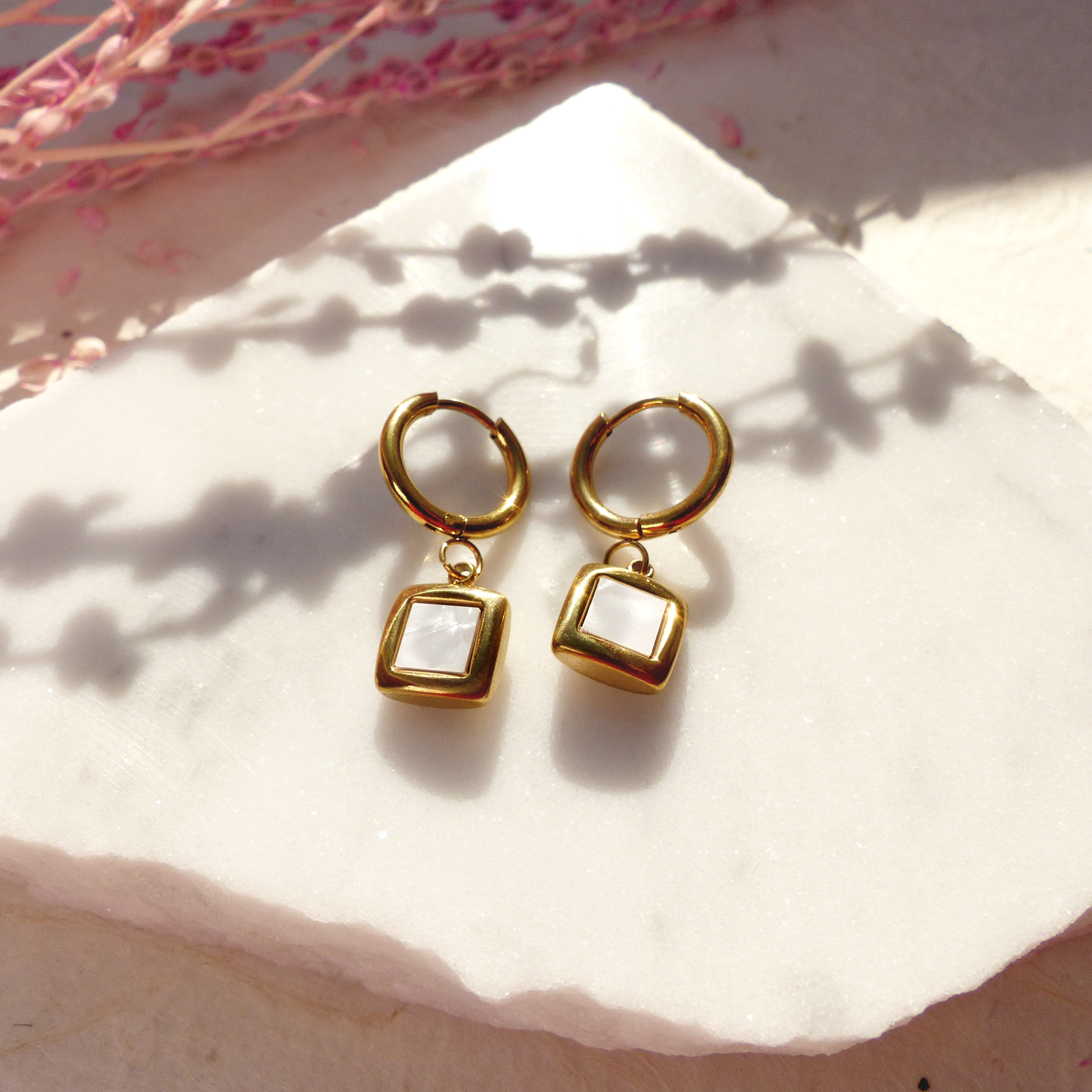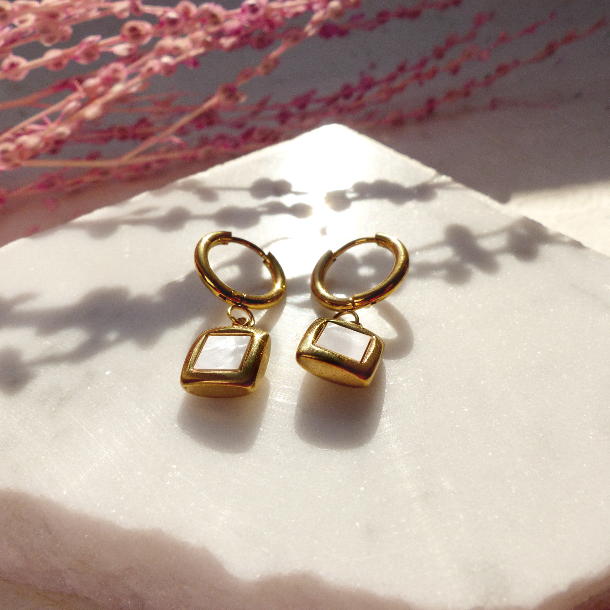 Die kleinen goldenen Ringe aus vergoldetem Edelstahl tragen zarte Anhänger – einer oval, der andere eckig, beide haben schimmerndem Perlmutt eingefasst. Fein und elegant umrahmen sie das Gesicht - perfekt für Tage, an denen du mit sanften Akzenten glänzen möchtest, sei es bei einem ruhigen Treffen oder einem stilvollen Abend.