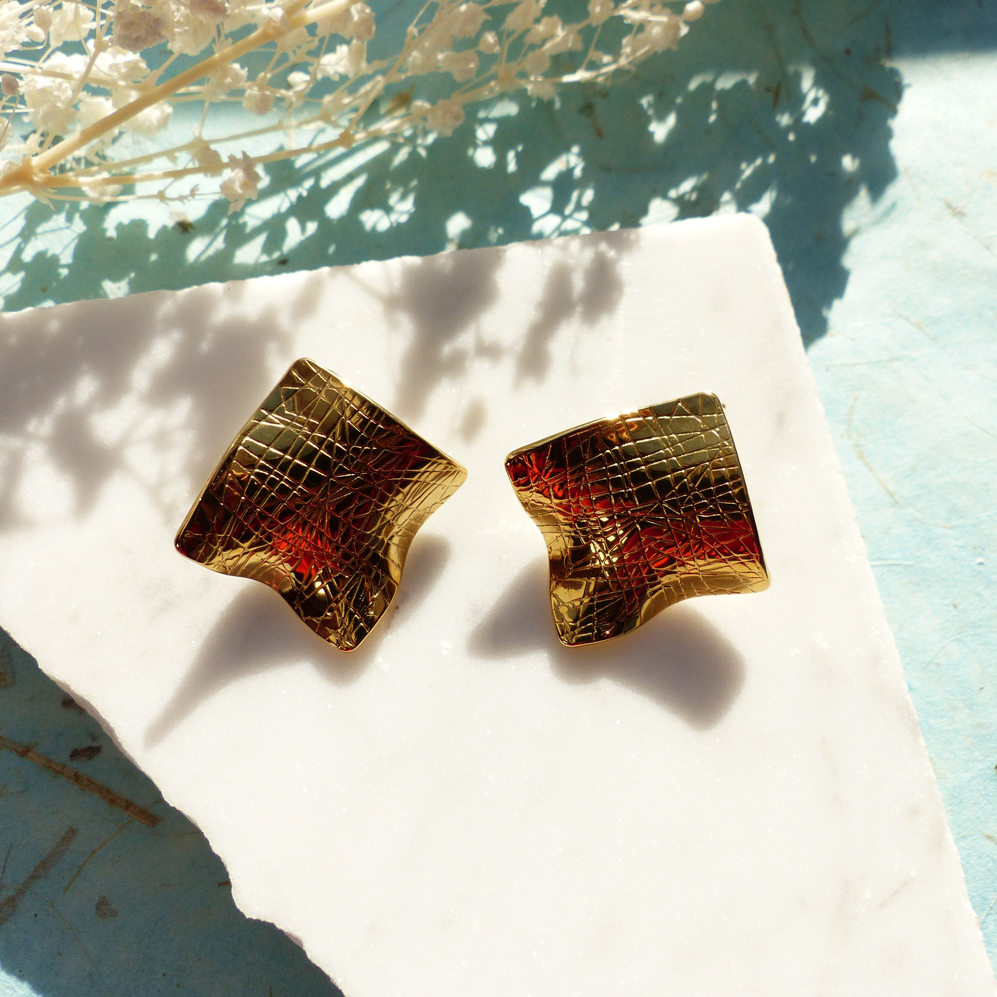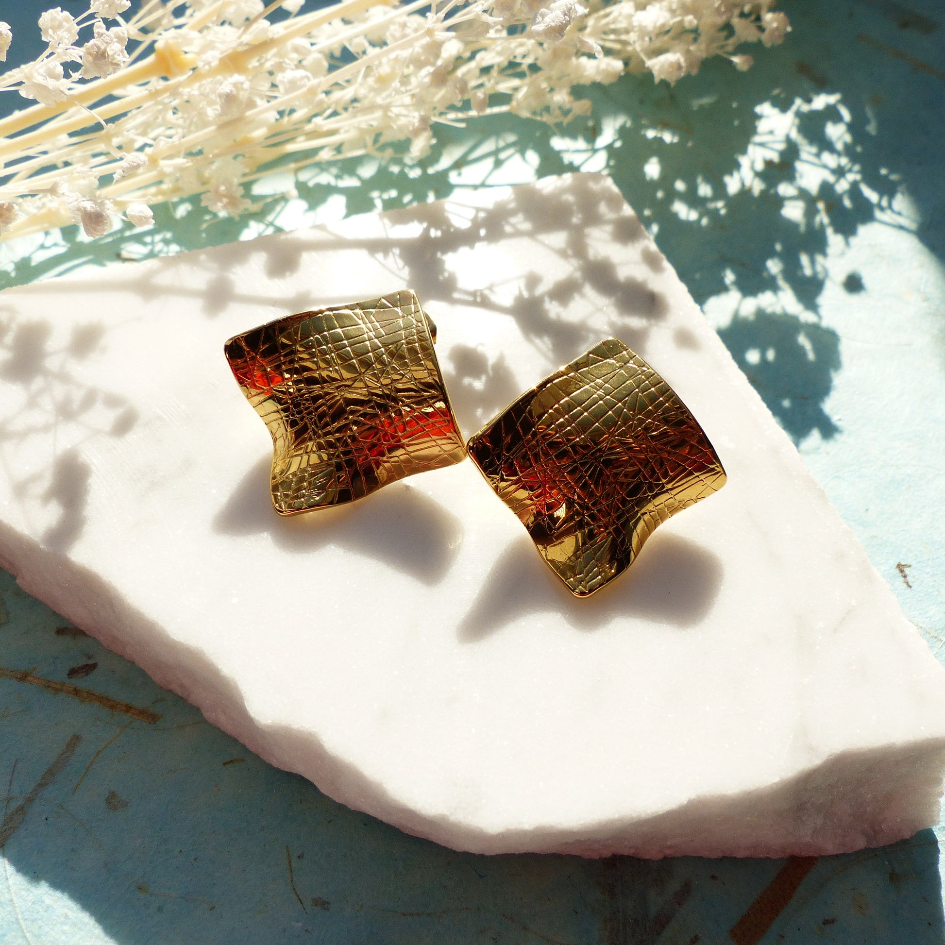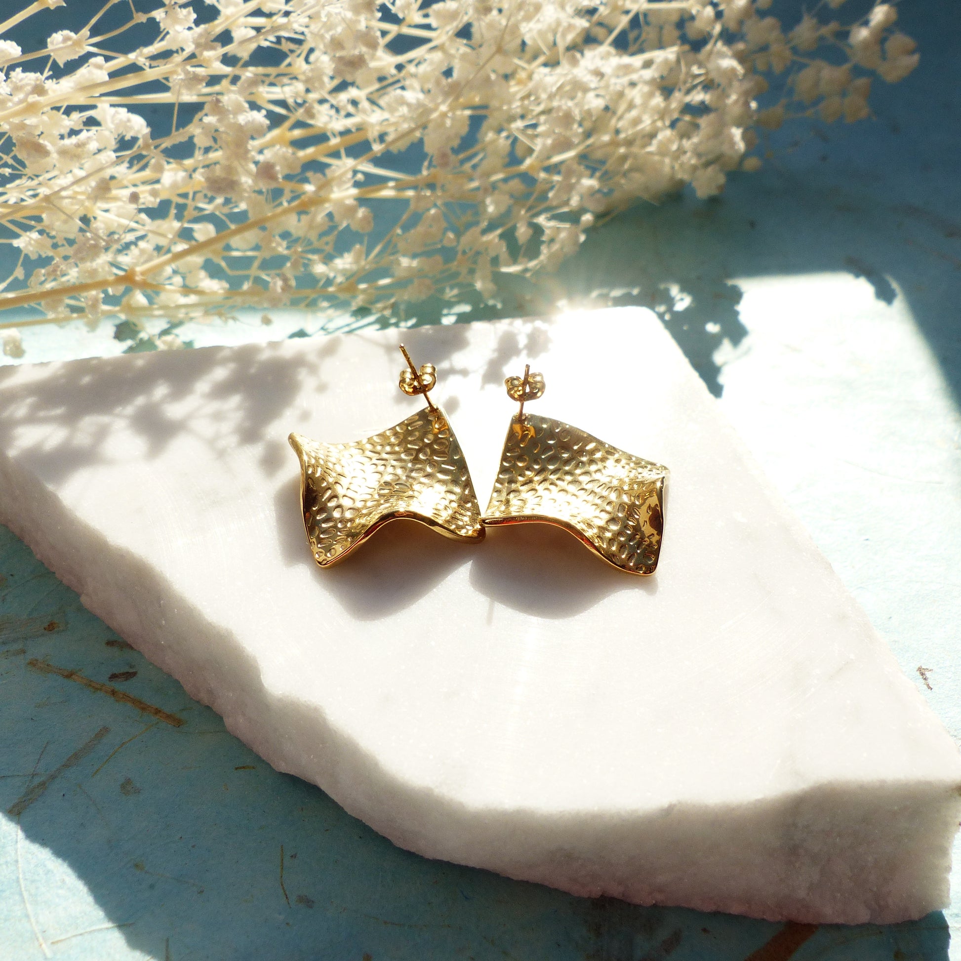 Diese Ohrringe aus 18 K vergoldetem Edelstahl sind kleine Kunstwerke: gewellte Goldplättchen mit feiner Schraffur, die das Licht lebendig bricht. Eigenwillig, aber sehr stilvoll und edel, geben sie deinem Look einen besonderen Hauch von Raffinesse. Sie passen zu einem eleganten Dinner oder einem kreativen Arbeitsoutfit.