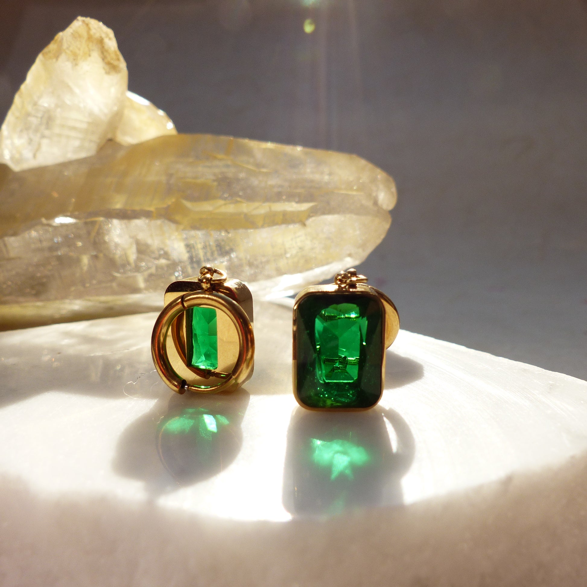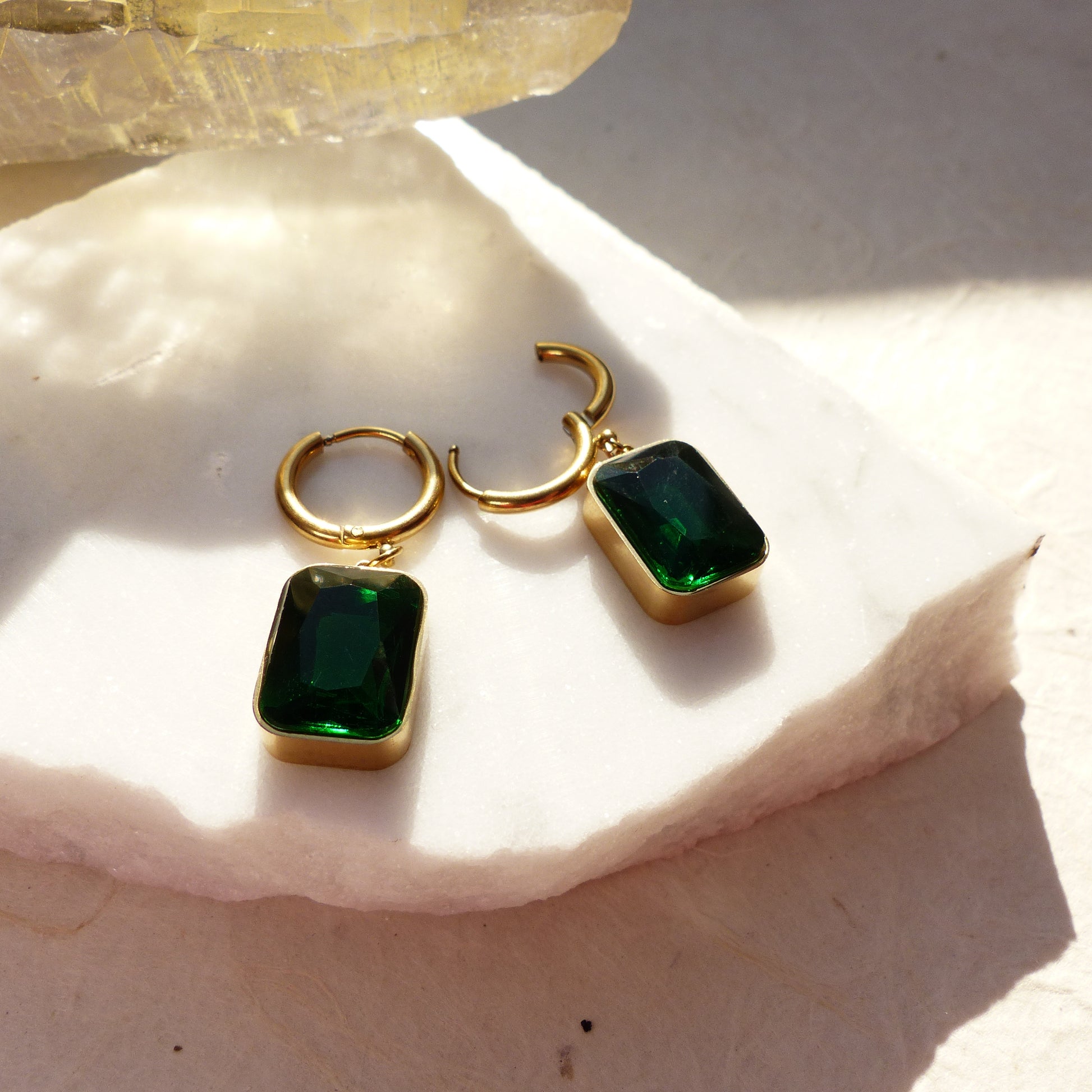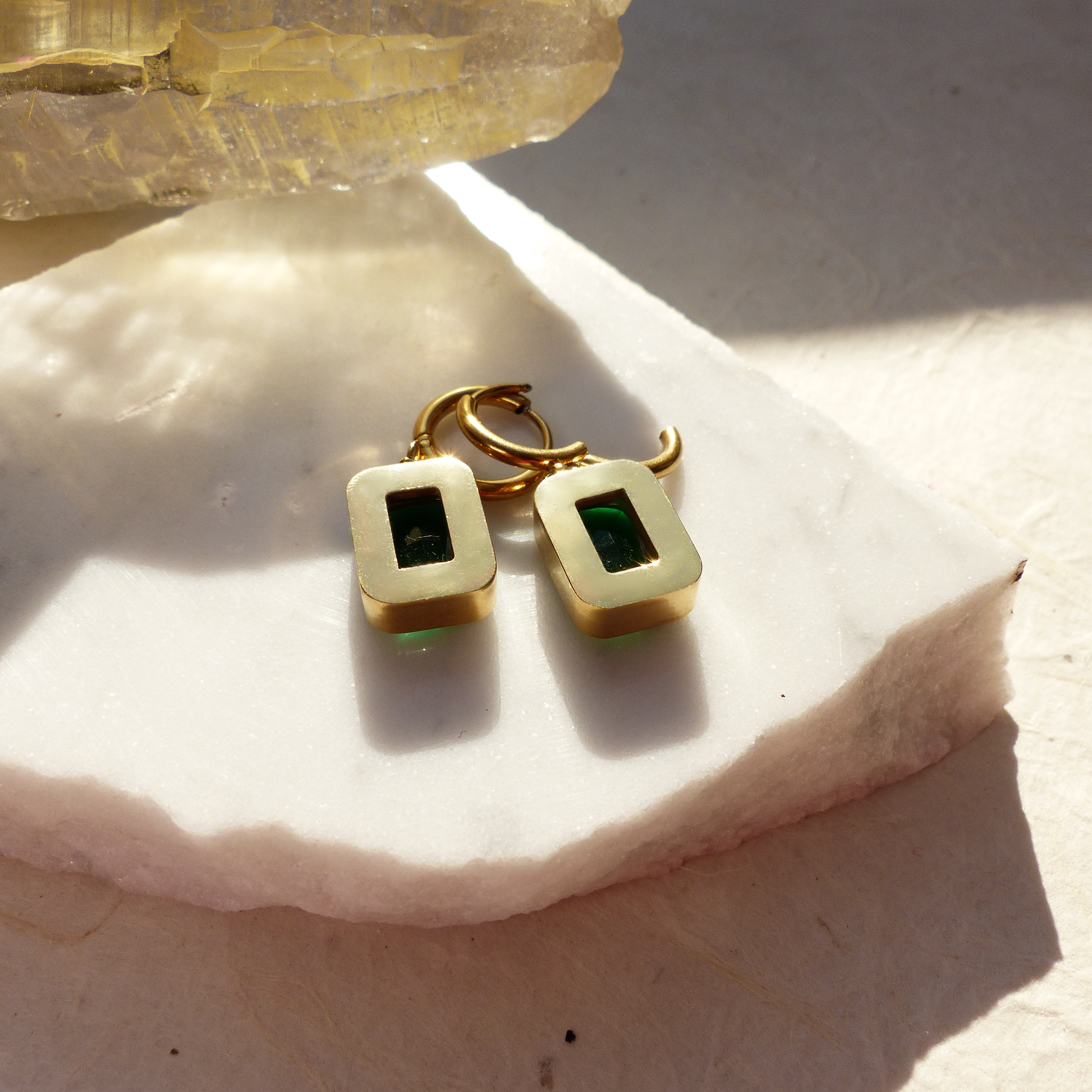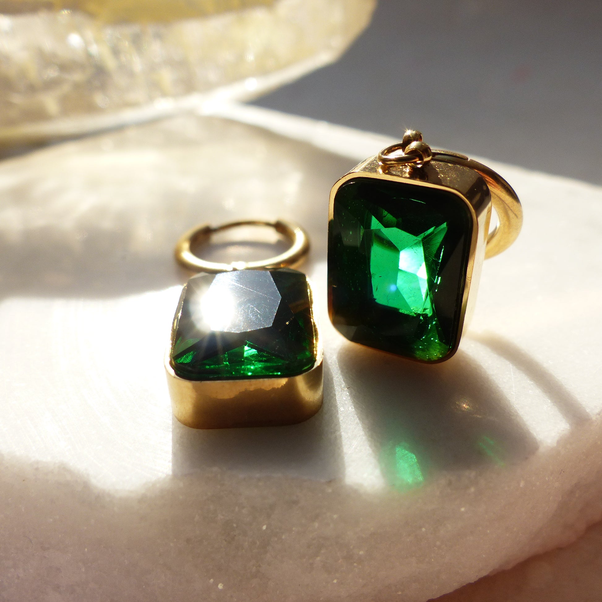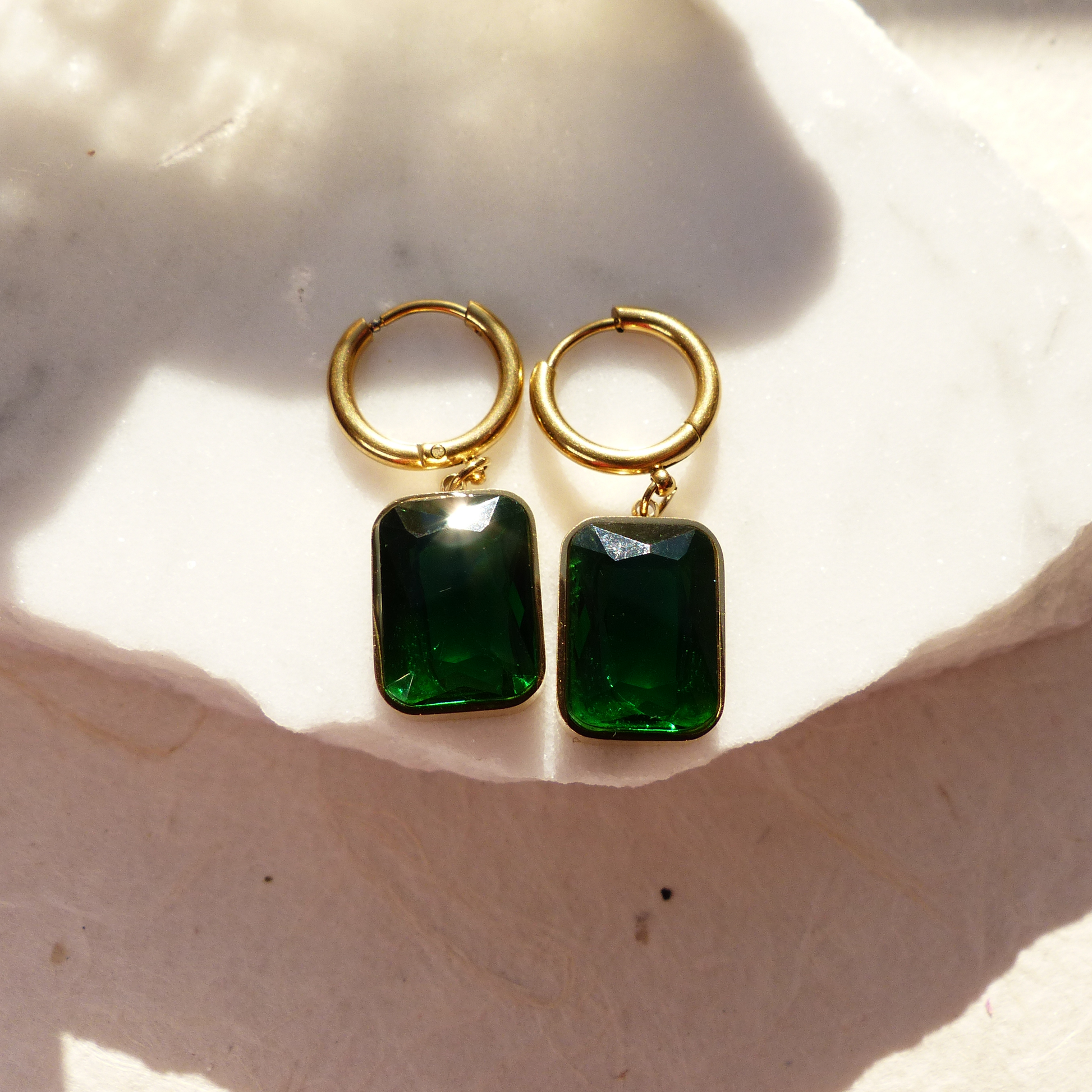Diese Ohrringe aus vergoldetem Edelstahl tragen einen rechteckigen Anhänger in grüner Smaragd-Optik. Der facettierte Stein lässt Licht von hinten durchscheinen und erzeugt ein intensives Leuchten, das perfekt mit dem warmen Goldton harmoniert. Markant und edel, sind sie der Star eines gekonnten Outfit.