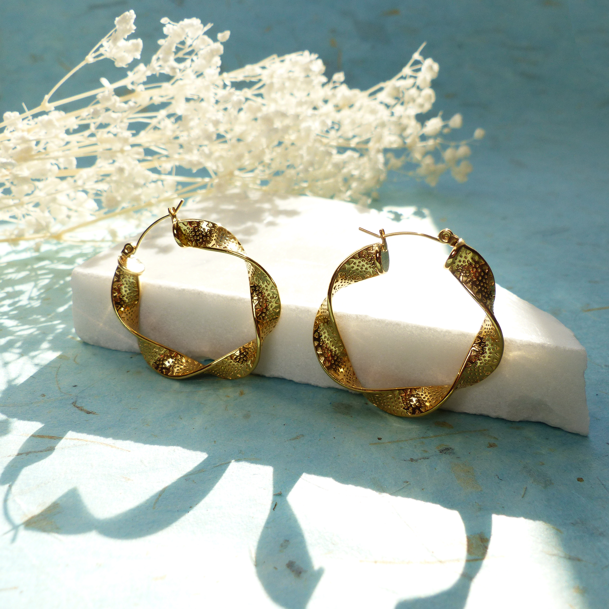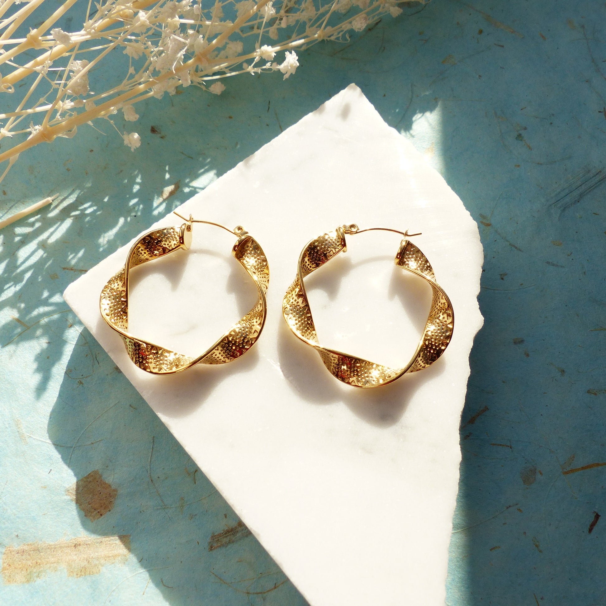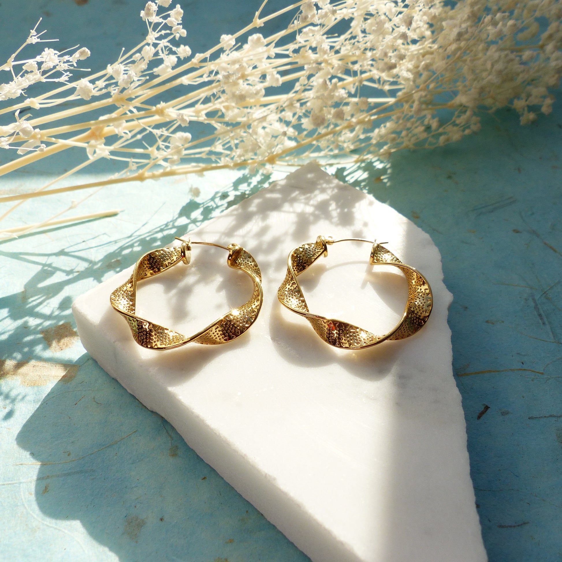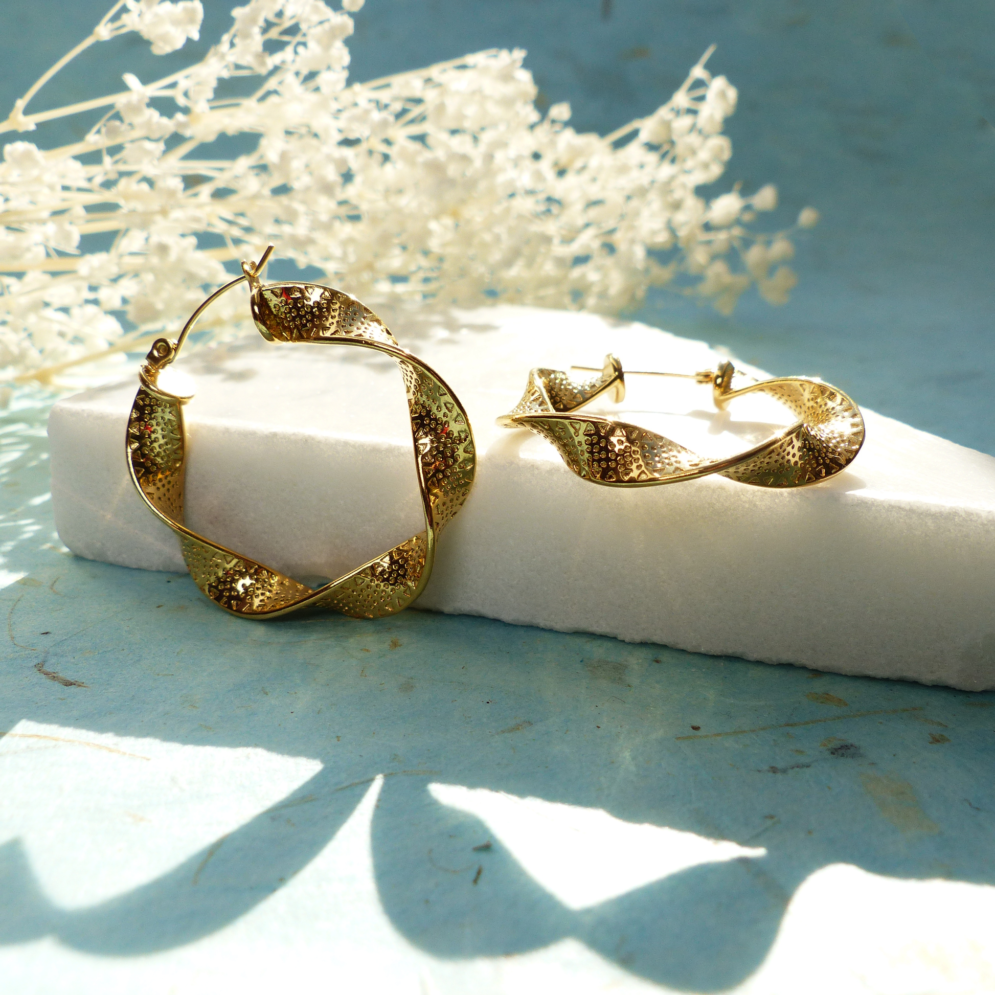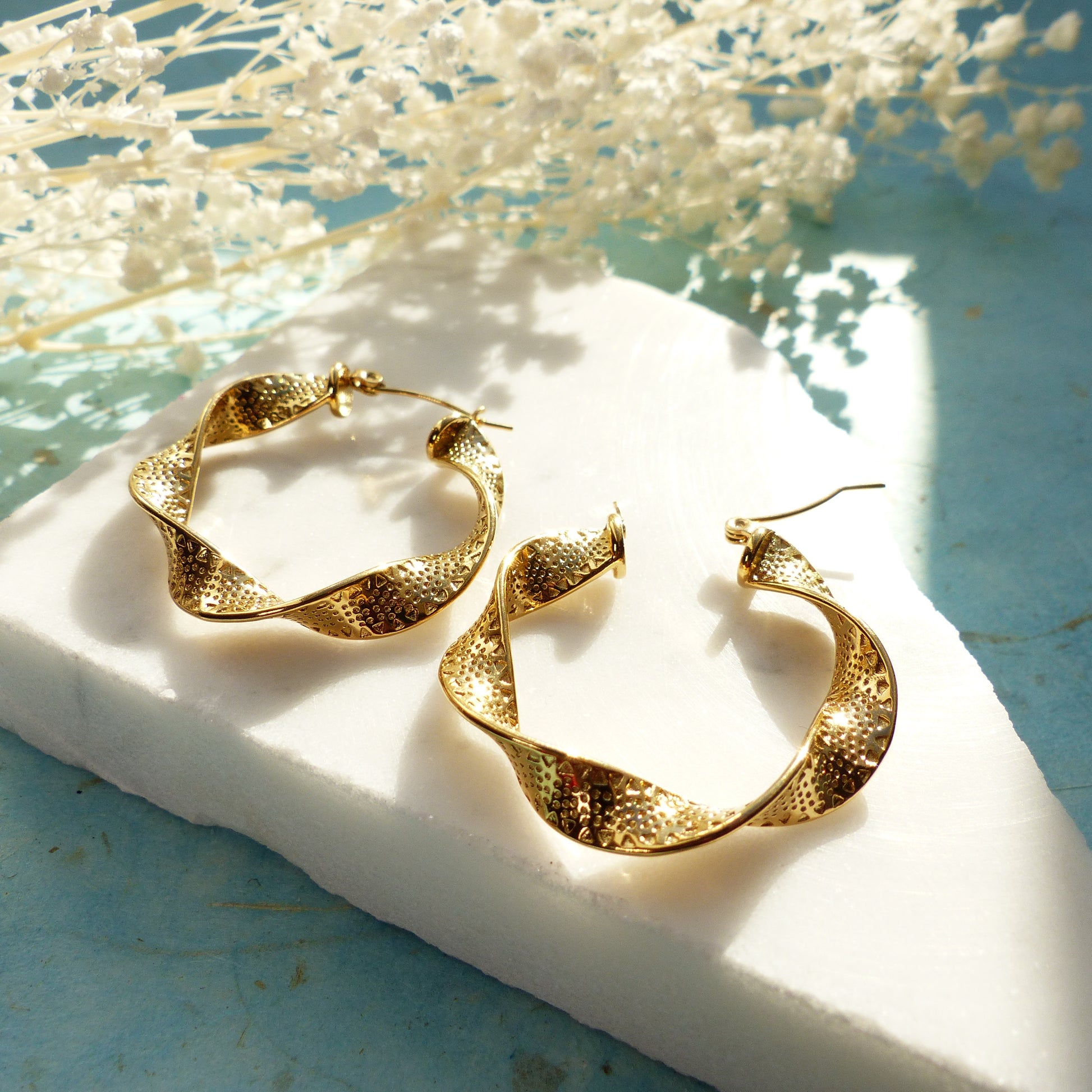Diese gedrehten Creolen aus vergoldetem Edelstahl greifen mit ihrer punktierten Oberfläche den Charme der 80er auf – elegant, aber mit Charakter. Die Struktur verleiht einen indirekten Glitzereffekt, ohne aufdringlich zu wirken. Ein zeitloser Klassiker, der deinen Look veredelt. Perfekt für Anlässe, die ein wenig Glamour vertragen.